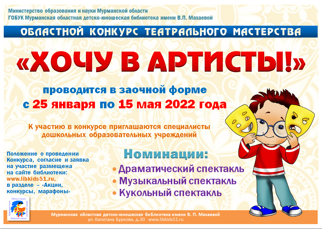 25 января 2022 года в Мурманской областной детско-юношеской библиотеке имени В.П. Махаевой при поддержке Министерства образования и науки Мурманской области стартует областной конкурс театрального мастерства «Хочу в артисты!», который направлен на поддержку активного проявления творческих способностей детей и педагогов.