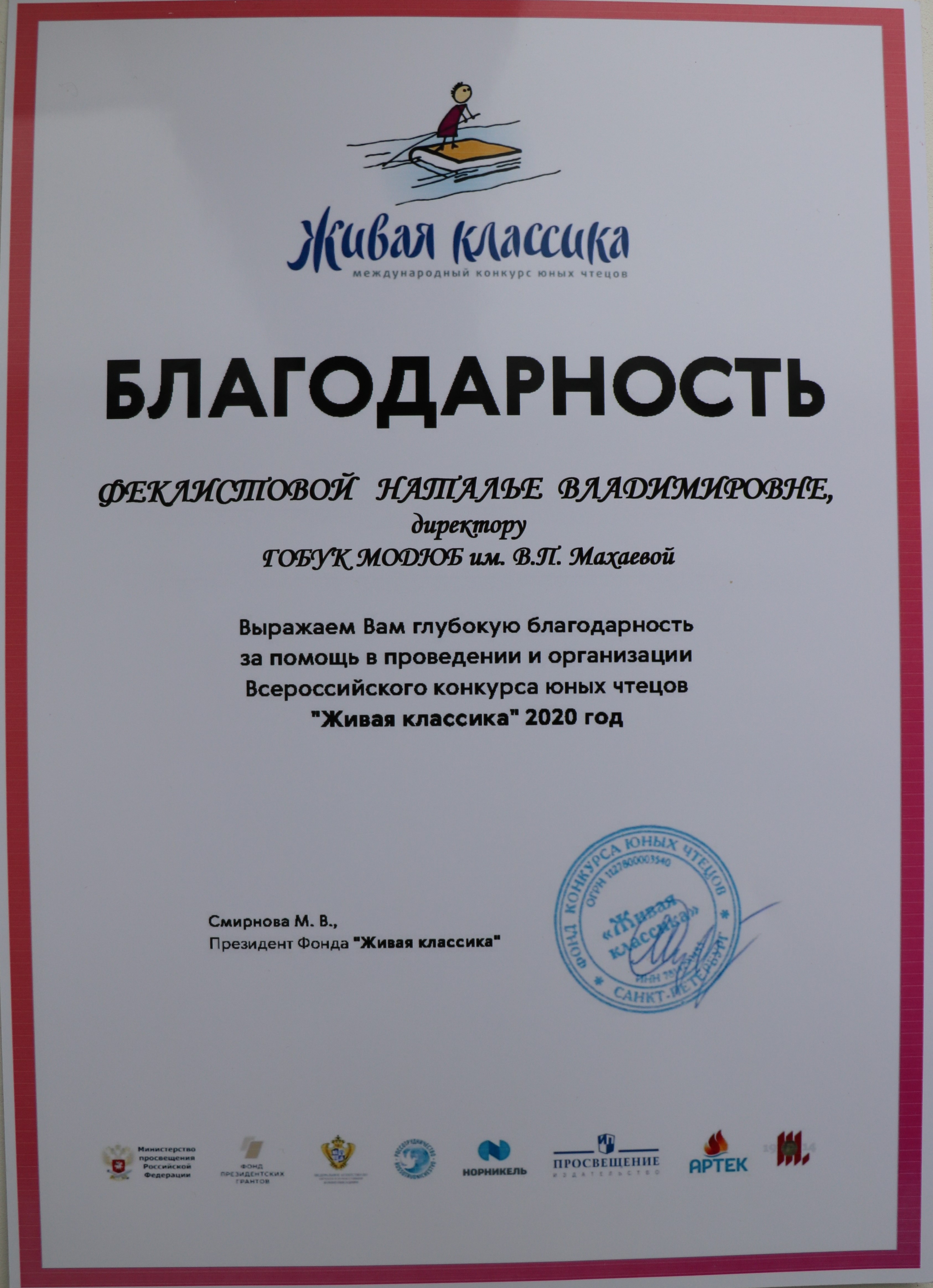 Благодарность от президента Фонда «Живая классика» Смирновой М. В.
