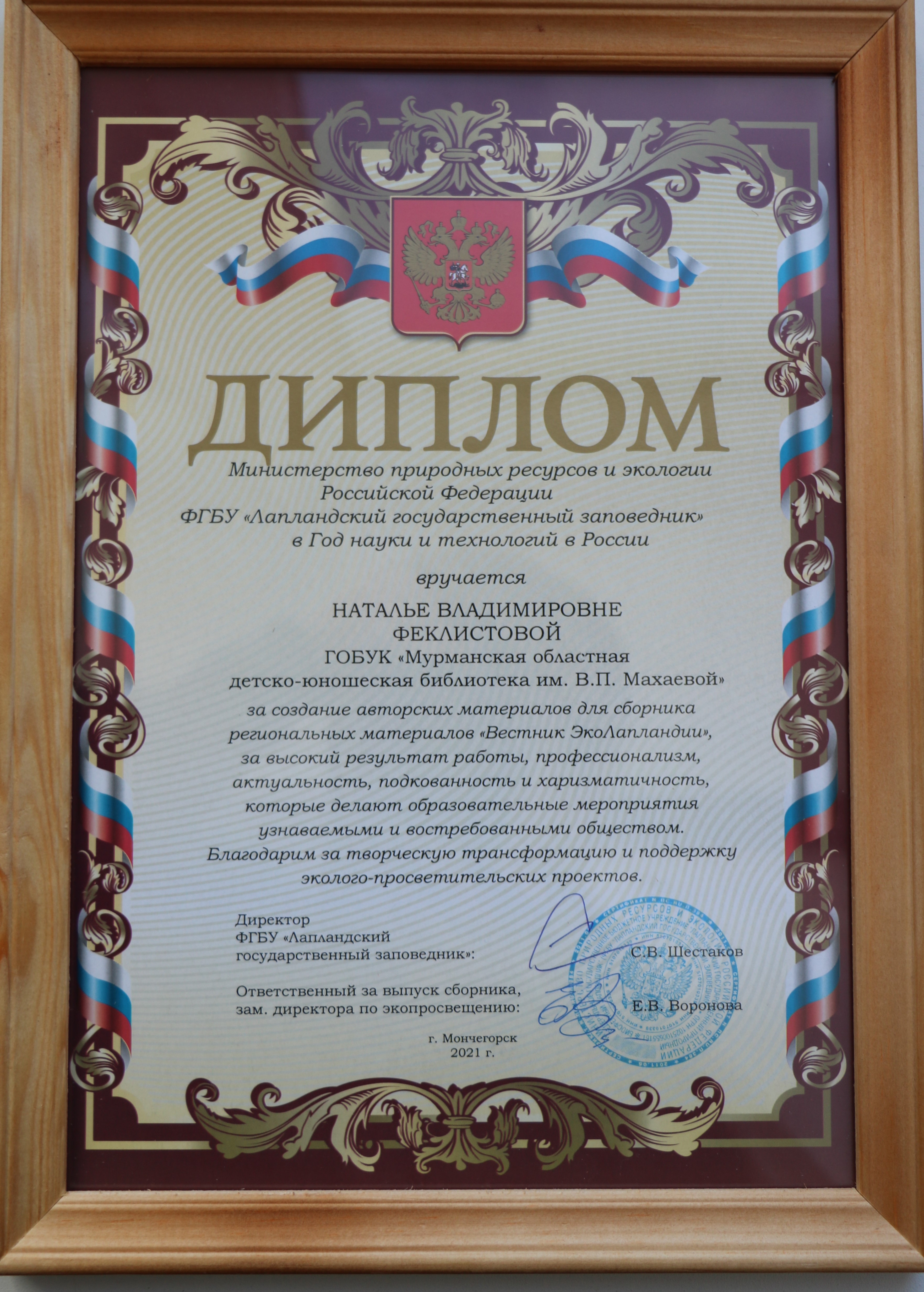 Диплом за создание авторских материалов для сборника региональных материалов «Вестник ЭкоЛапландии», за высокий результат работы, профессионализм, актуальность, подкованность и харизматичность, которые делают образовательные мероприятия узнаваемыми и востребованными обществом