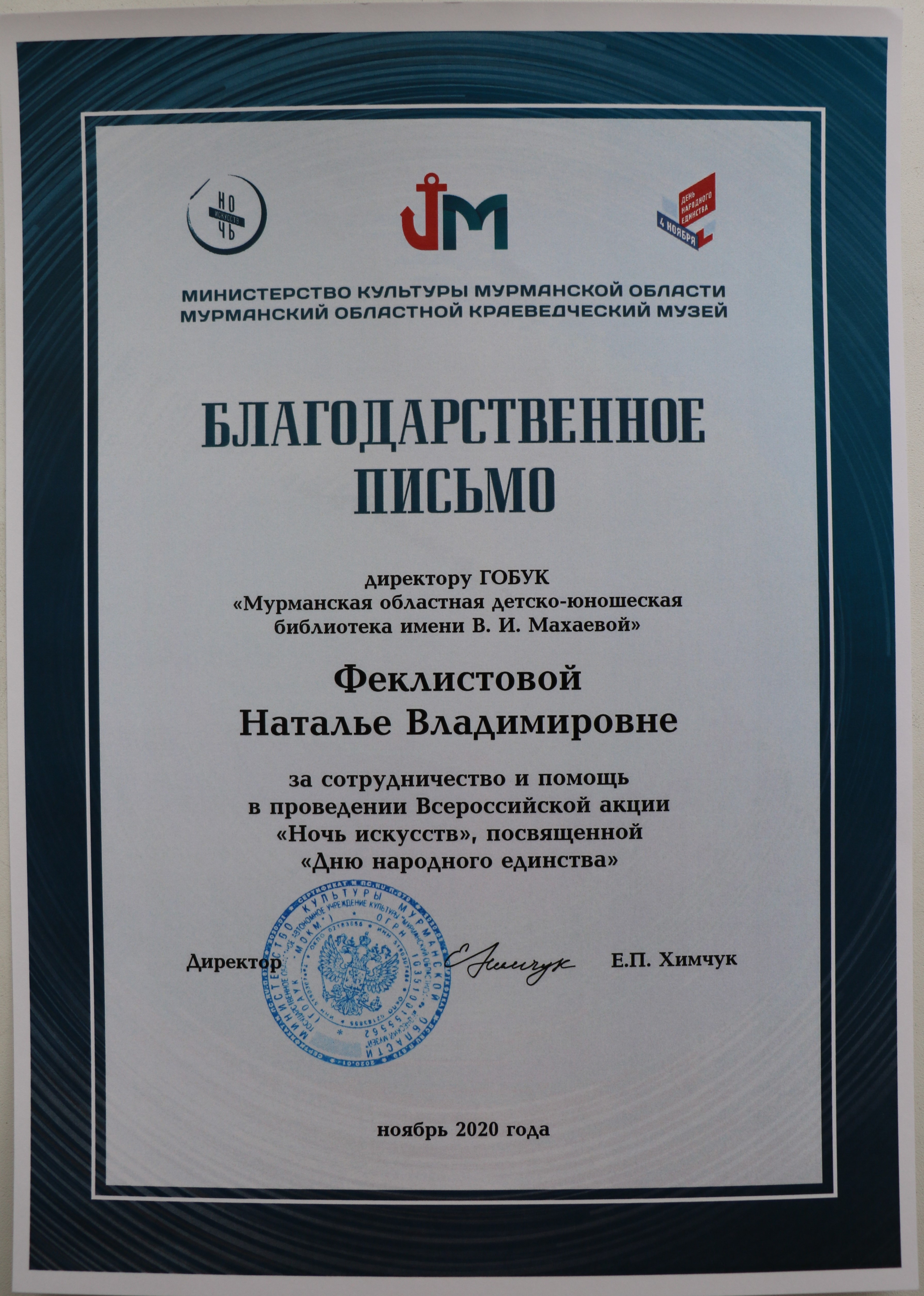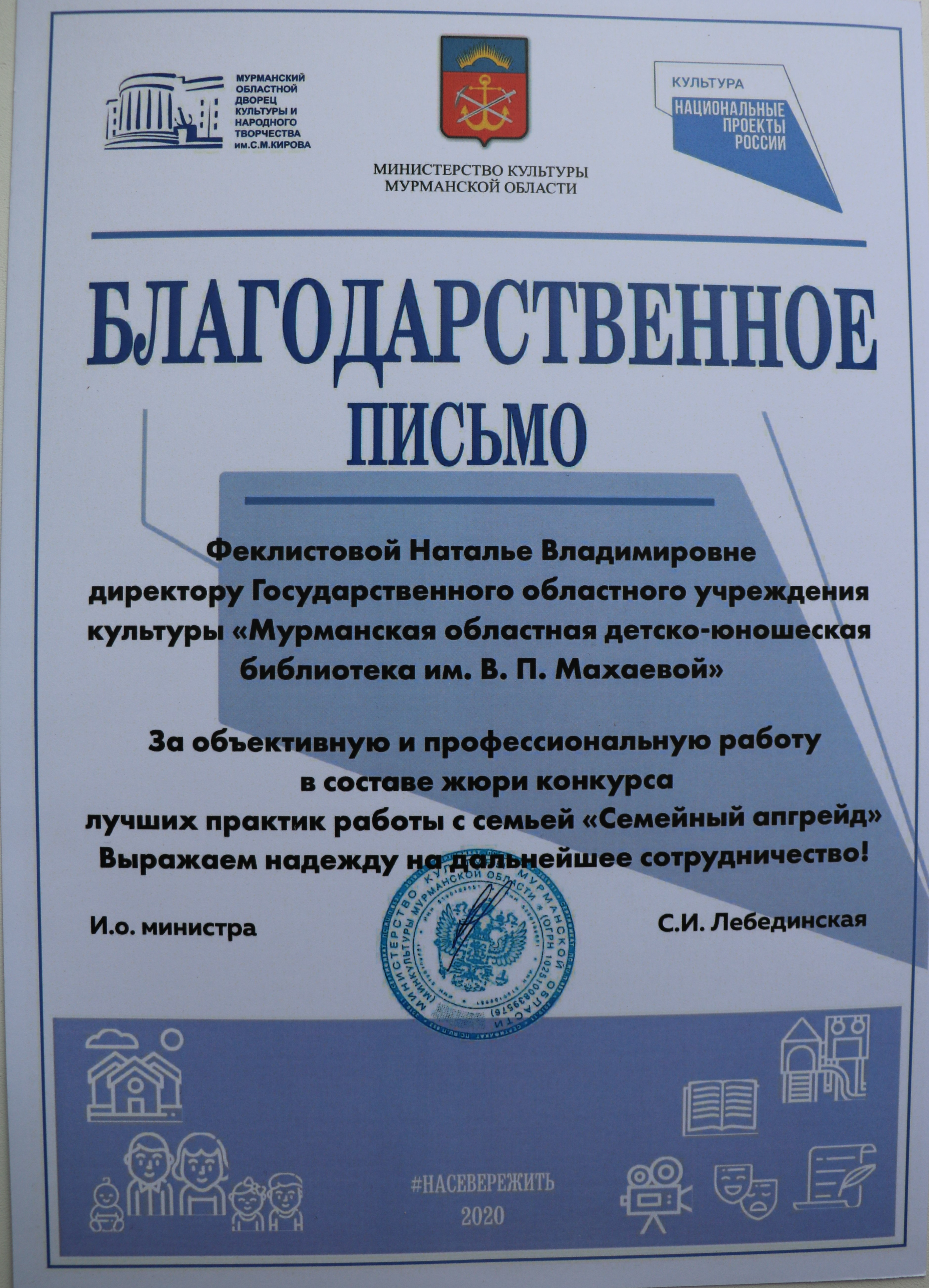 Благодарственное письмо от и.о. министра культуры Мурманской области Лебединской С.И.