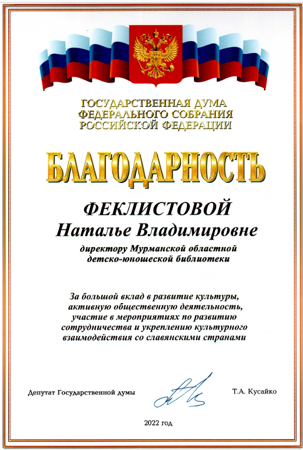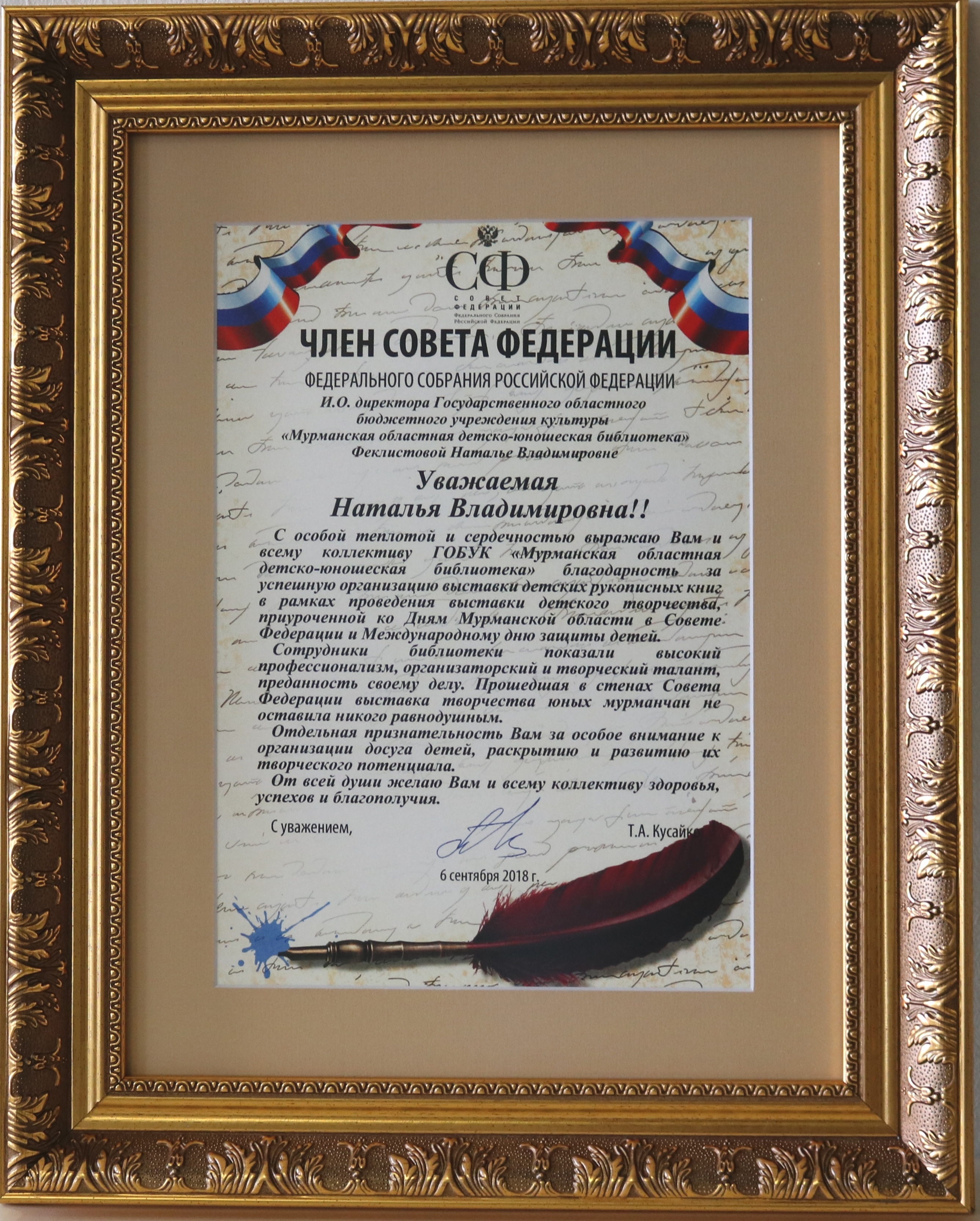 Благодарность от члена Совета Федерации по социальной политеки Кусайко Т.А.