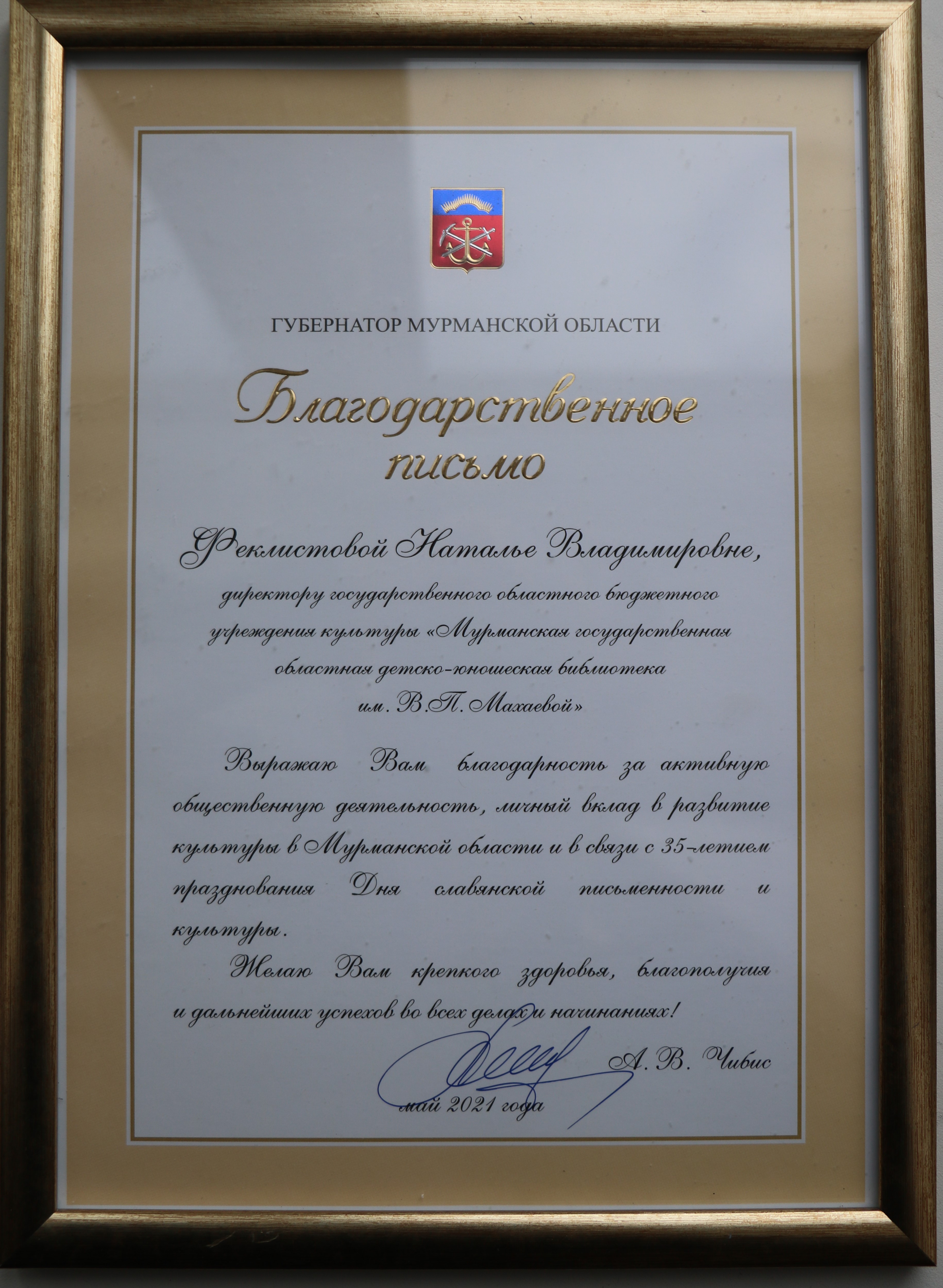 Благодарственное письмо от Губернатора Мурманской области Чибиса А.В.