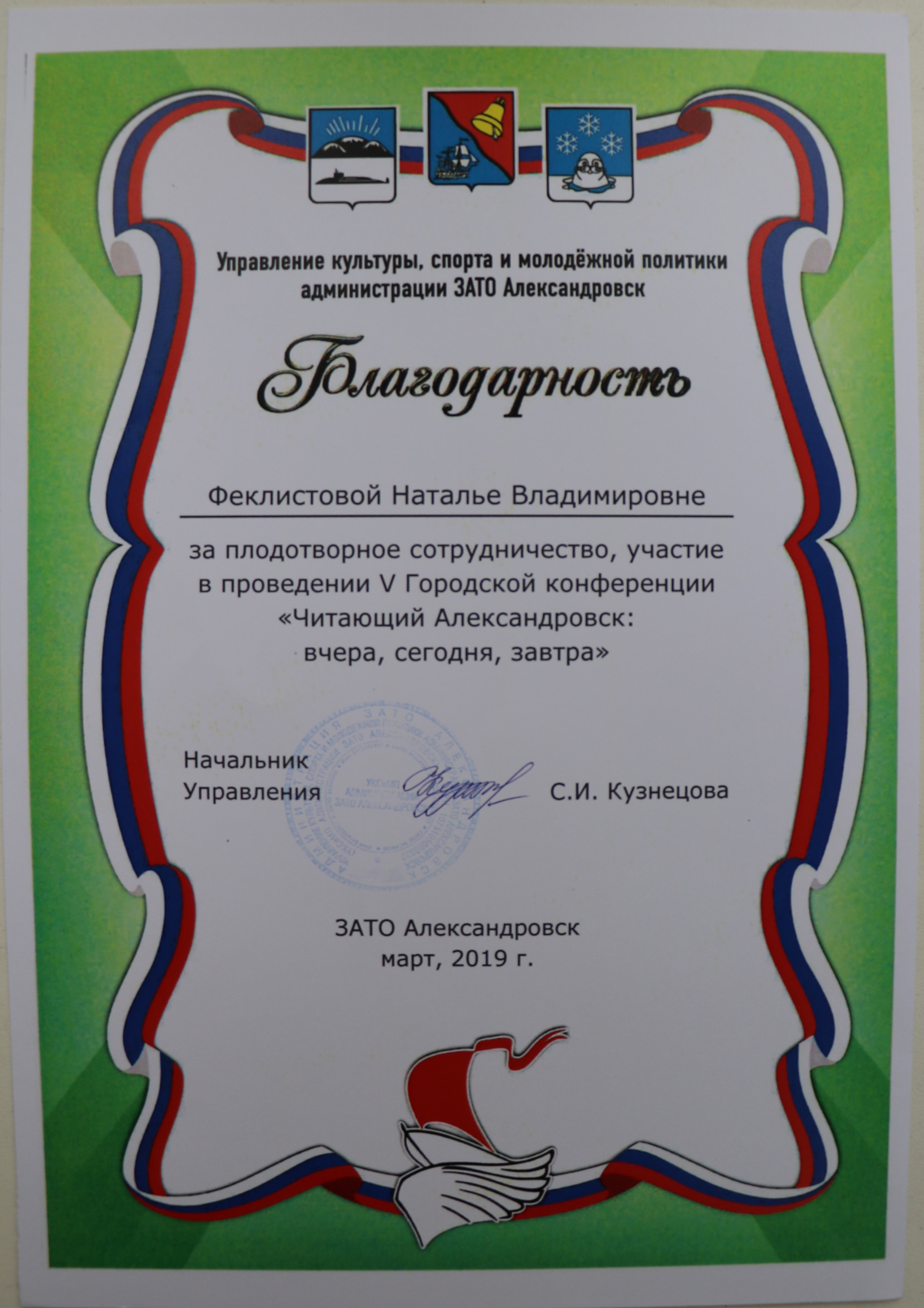 Благодарность от начальника управления культуры,спорта и молодежной политики администрации ЗАТО Александровск Кузнецовой С.И.
