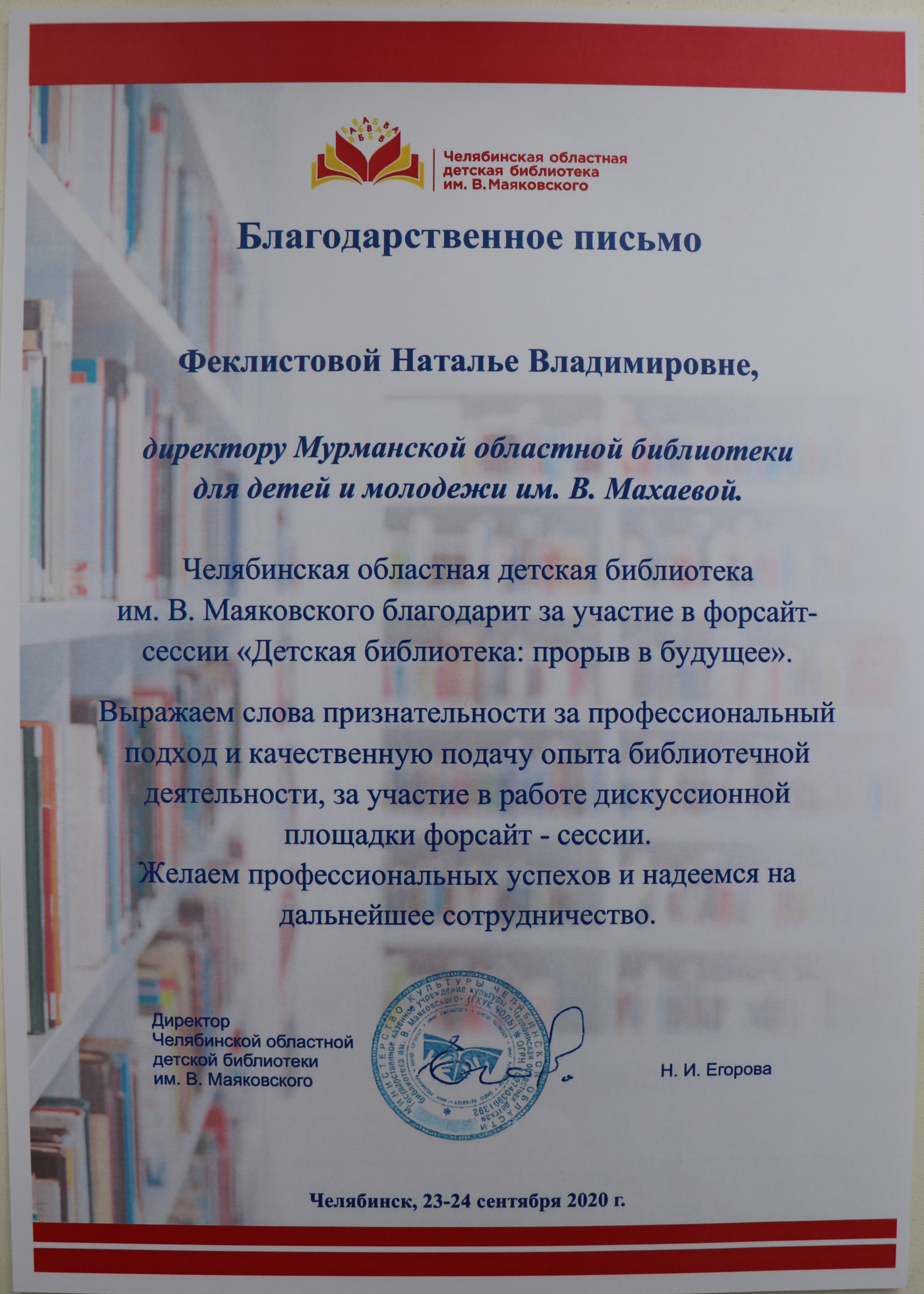 Благодарственноее письмо за участие в форсайт-сессии «Детская библиотека: прорыв в будущее»