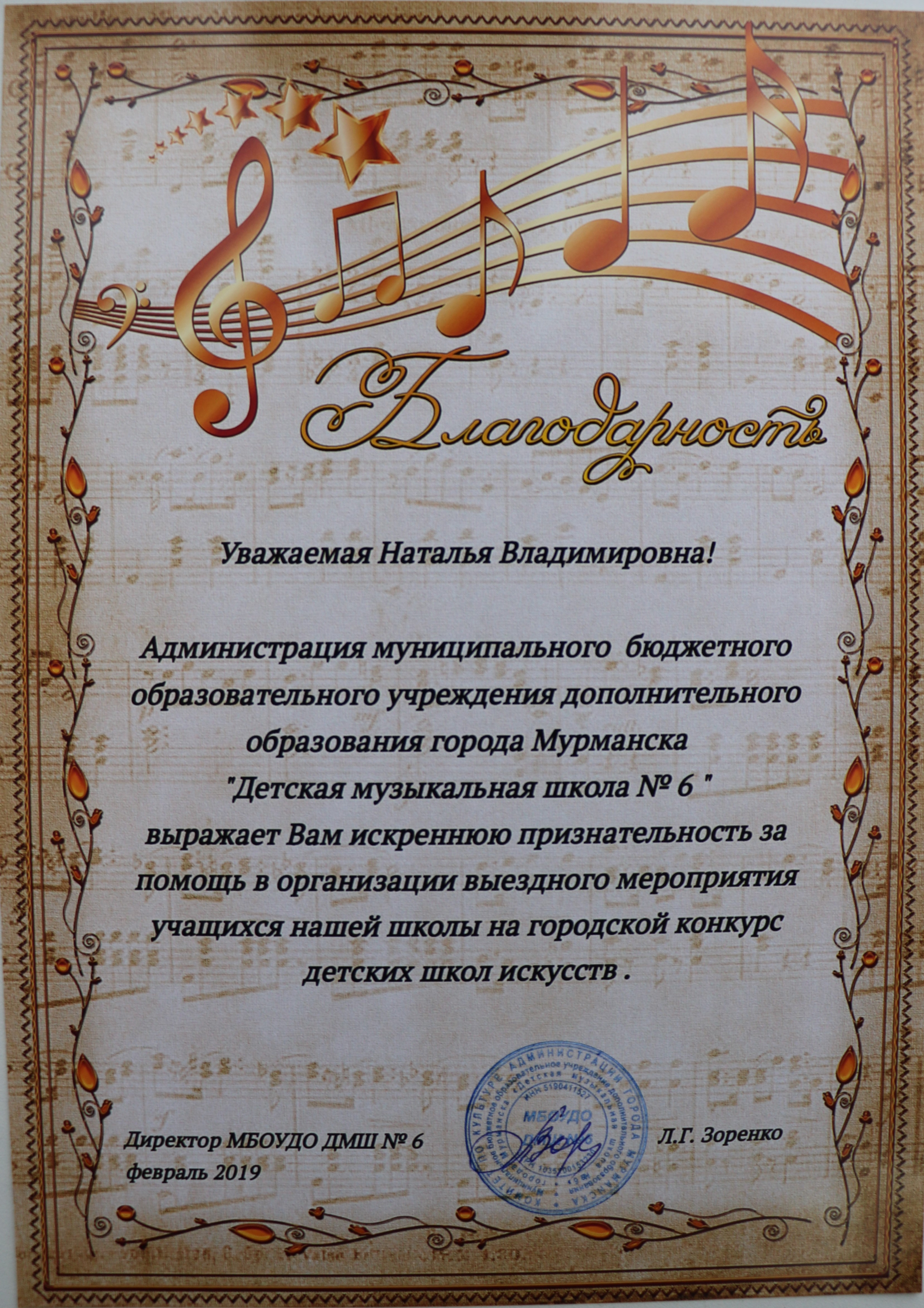 Благодарность за помощь в организации выездного мероприятия учащихся детской музыкальной школы на городской конкурс школ искусств