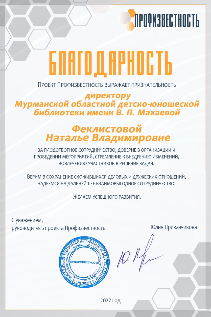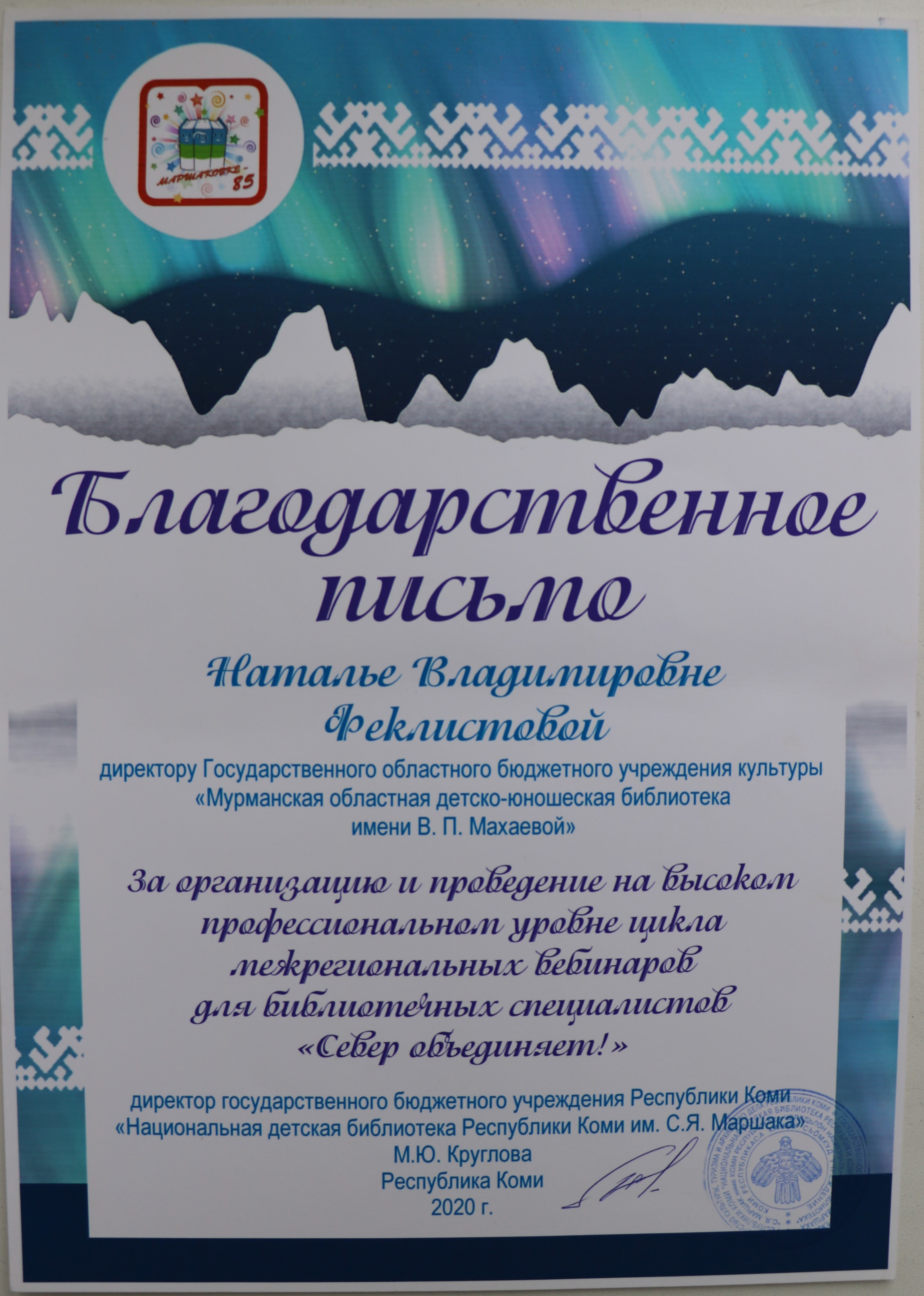Благодарственное письмо за организацию и проведение на высоком профессиональном уровне цикла межрегиональных вебинаров для библиотечных сотрудников «Север объединяет»