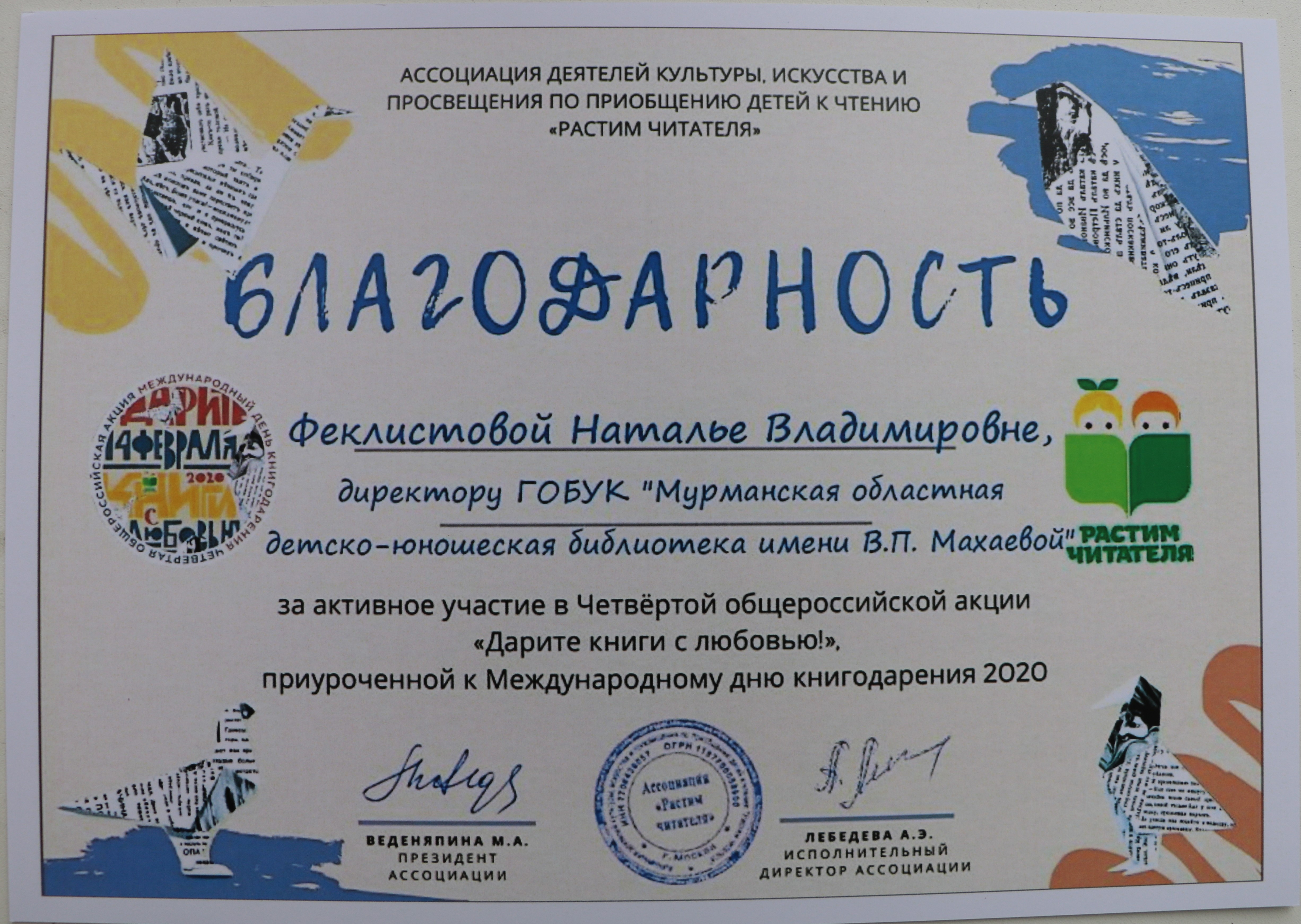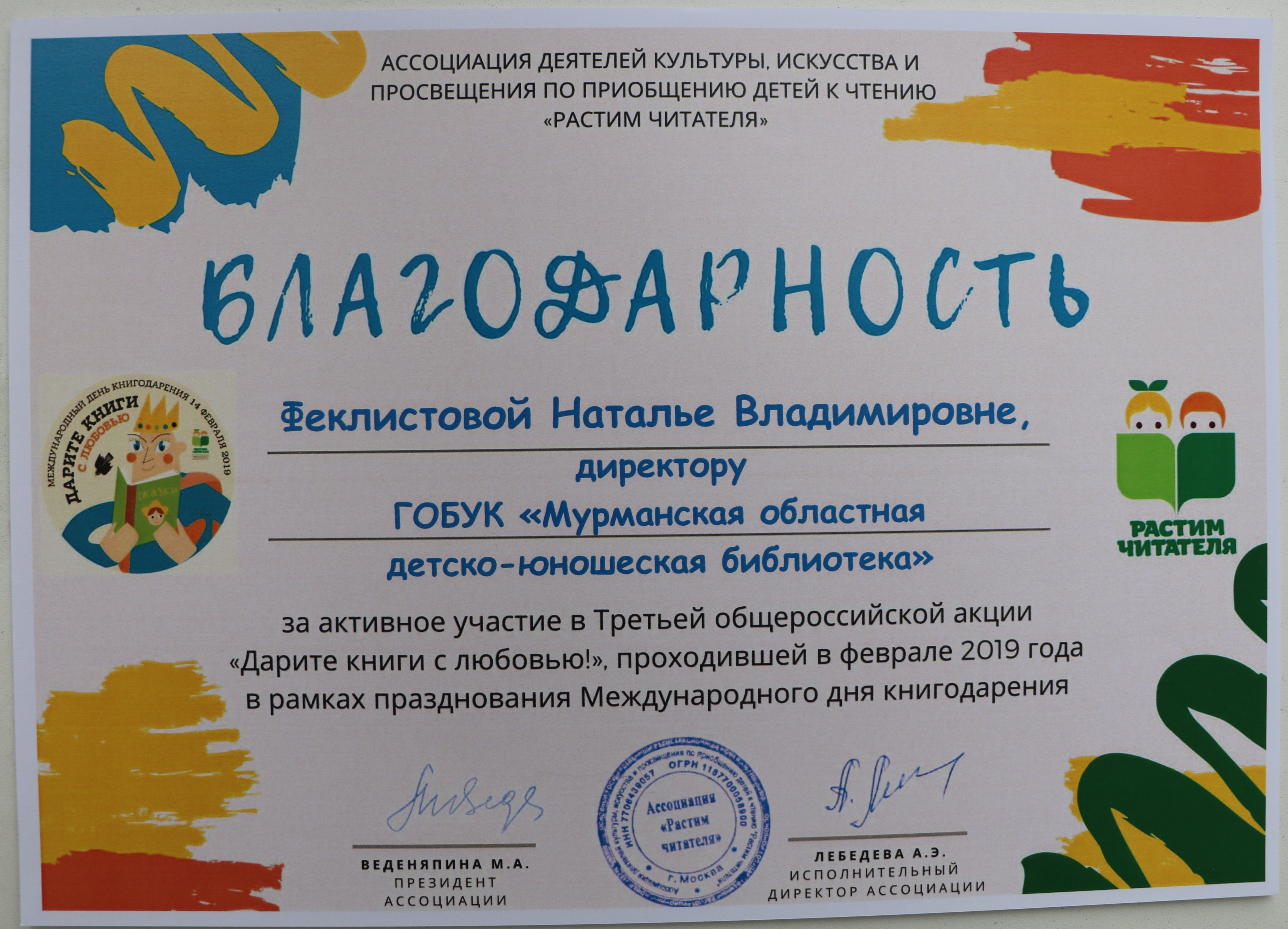 Благодарность за активное участие в Третьей общероссийской акции «Дарите книги с любовью!» в рамках празднования Международного дня книгодарения