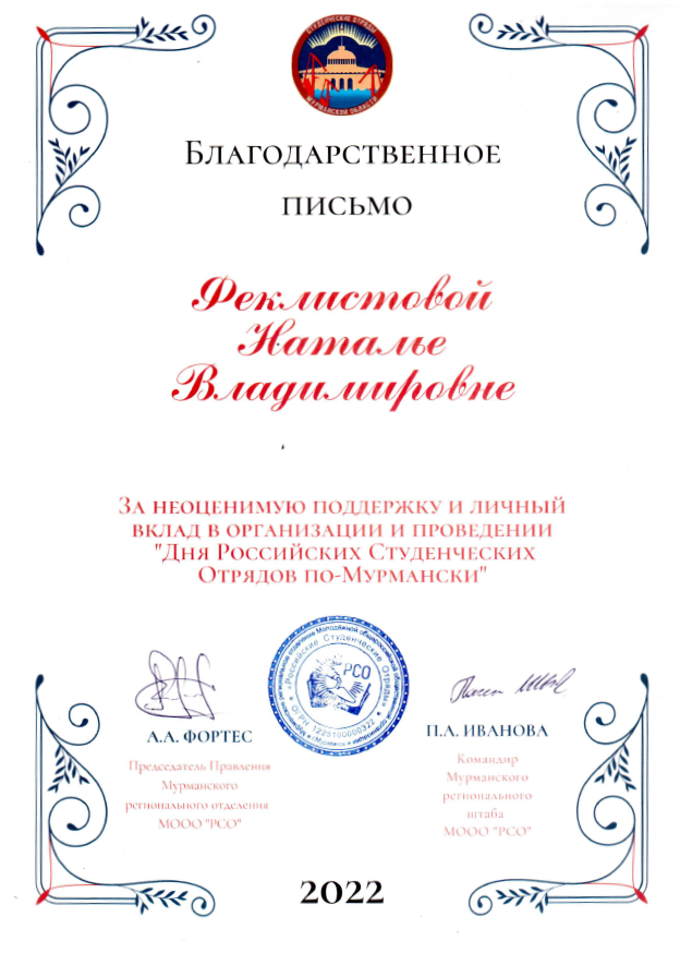 Благодарственное письмо за неоценимую поддержку в организации и проведения «Дня Российских Студенческих Отрядов по-Мурмански»