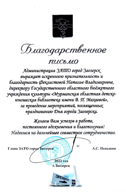 Благодарственное письмо за проведения мероприятий, посвященных празднованию Дня города Заозерска