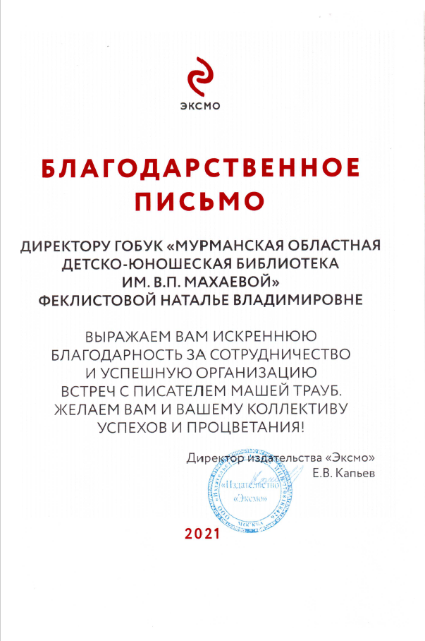 Благодарственное письмо за успешную организацию встреч с писателем Машей Трауб