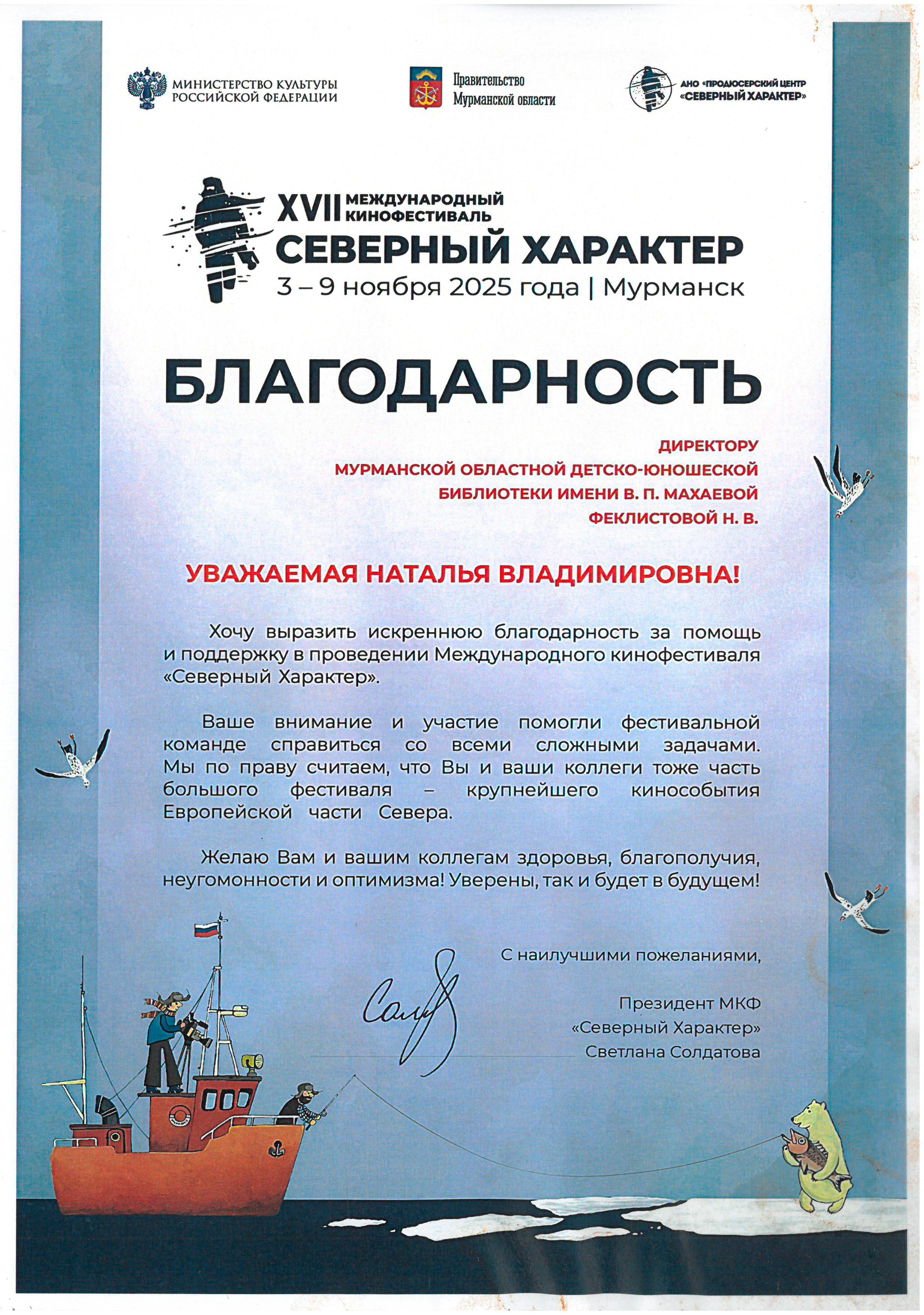 Благодарность за помощь и поддержку в проведении Международного кинофестиваля "Северный Характер"