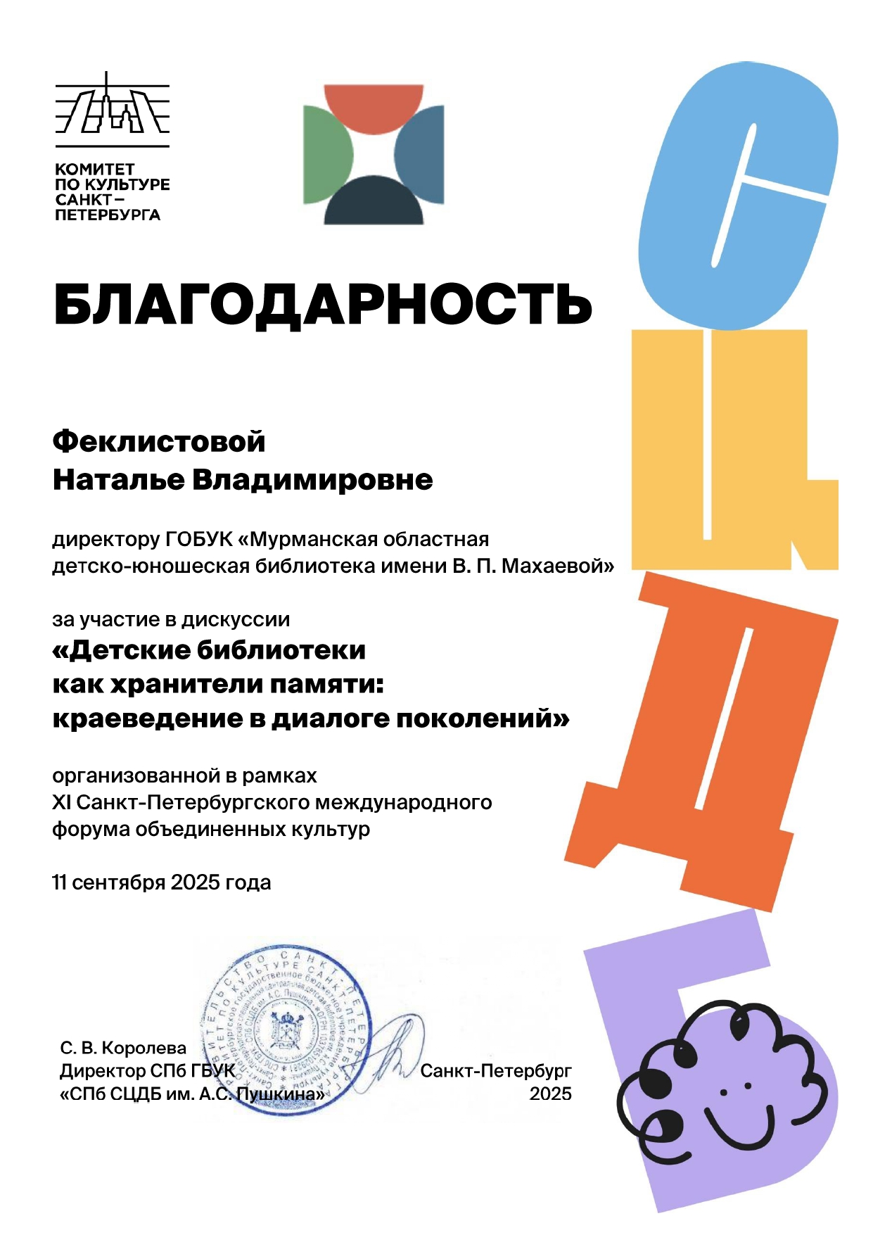 Благодарность за участие в дискуссии "Детские библиотеки как хранители памяти: краеведение в диалоге поколений"