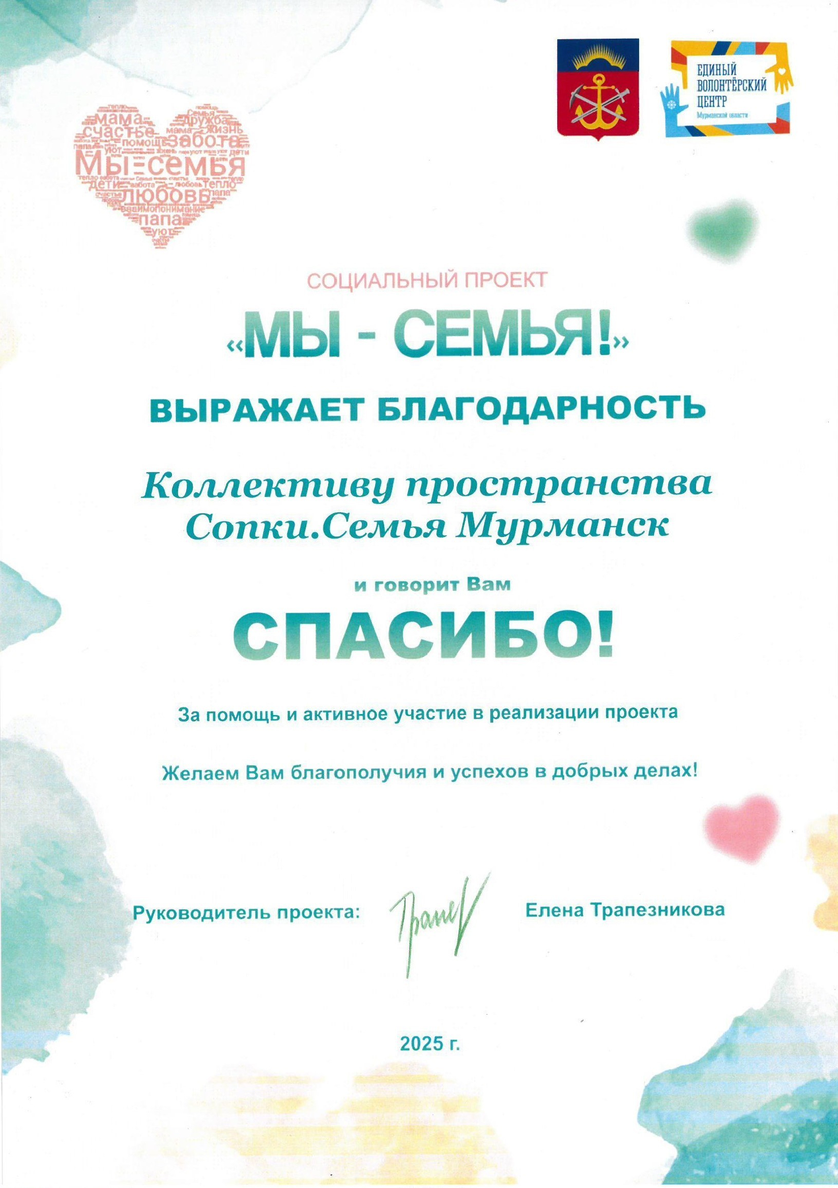 Благодарность коллективу пространства Сопки.Семья за помощь и активное участие в реалиизации социального проекта "Мы – семья!"