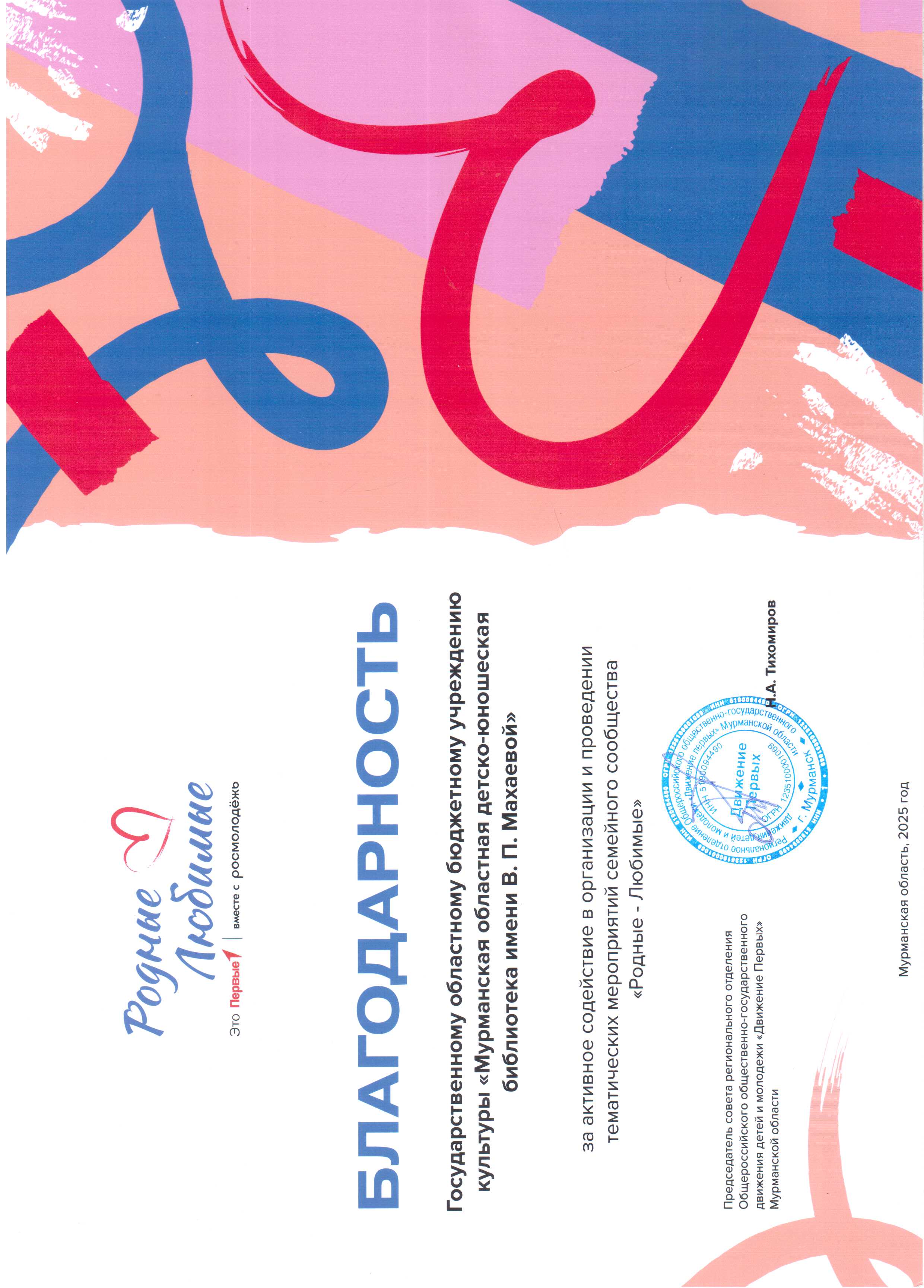 Благодарность за активное содействие в организации и проведении тематических мероприятий семейного сообщества "Родные – Любимые"