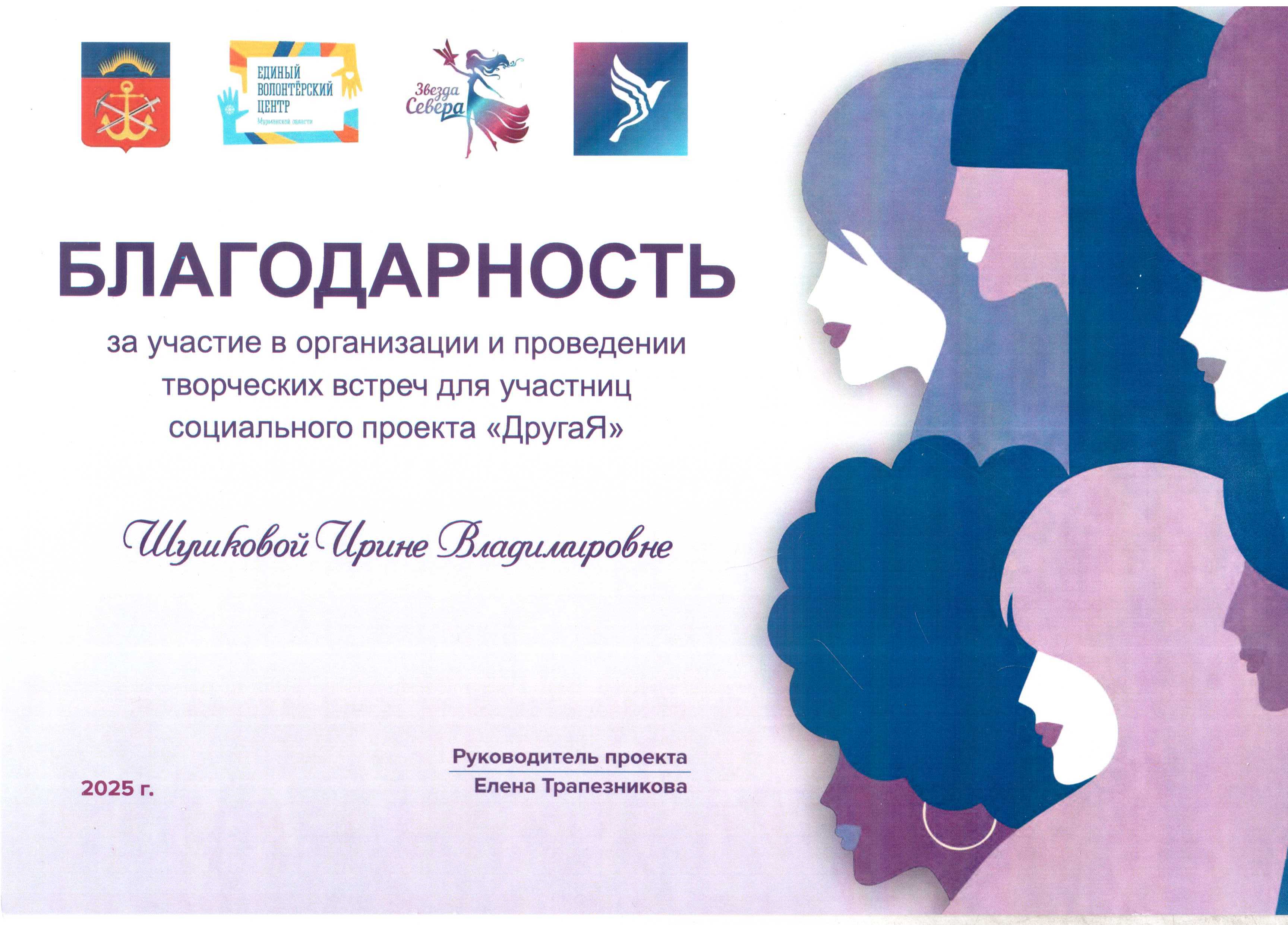 Благодарность Шушковой Ирине Владимировне за участие в организации и проведении творческих встреч для участниц социального проекта "Другая"