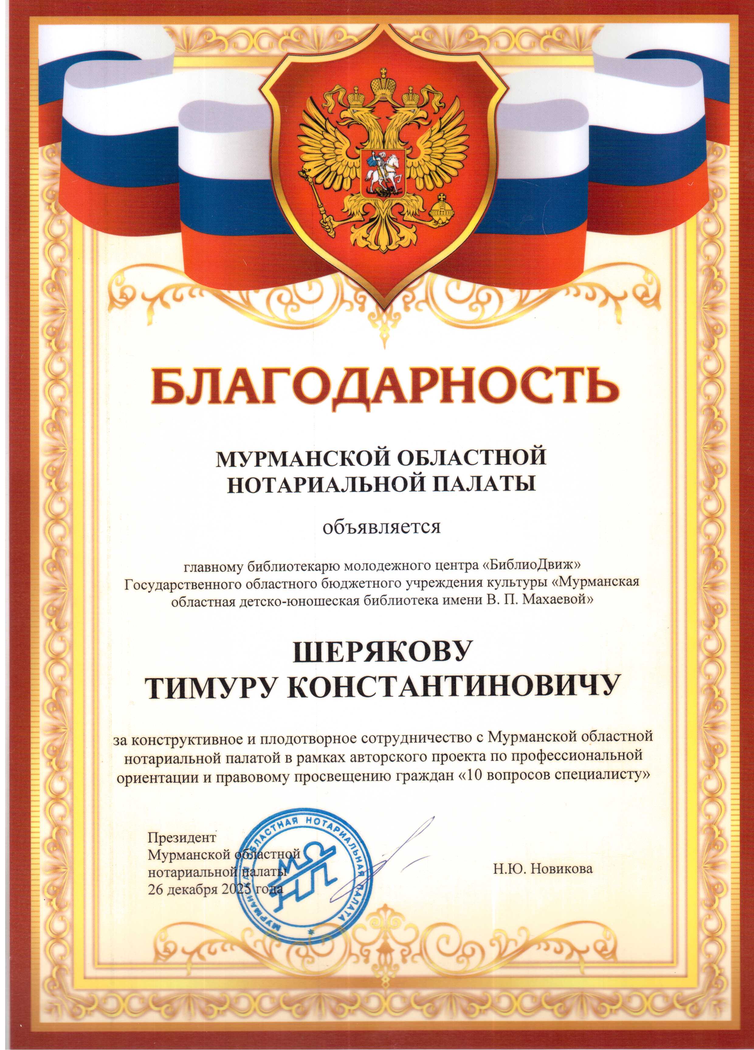 Благодарность Шерякову Тимуру Константиновичу за сотрудничество с Мурманской областной нотариальной палатой