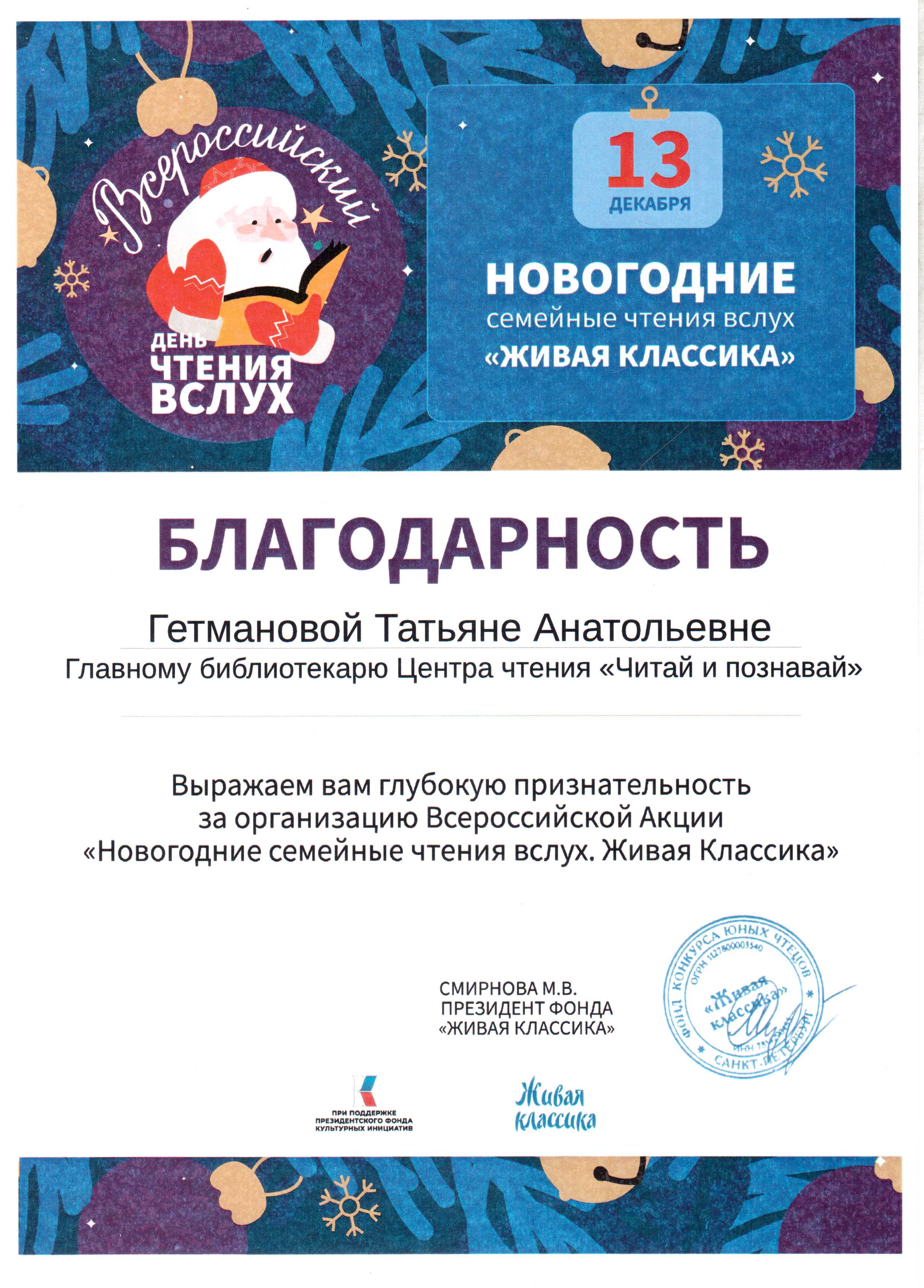 Благодарность Гетмановой Татьяне Анатольевне за организацию Всероссийской Акции "Новогодние семейные чтения вслух. Живая Классика"