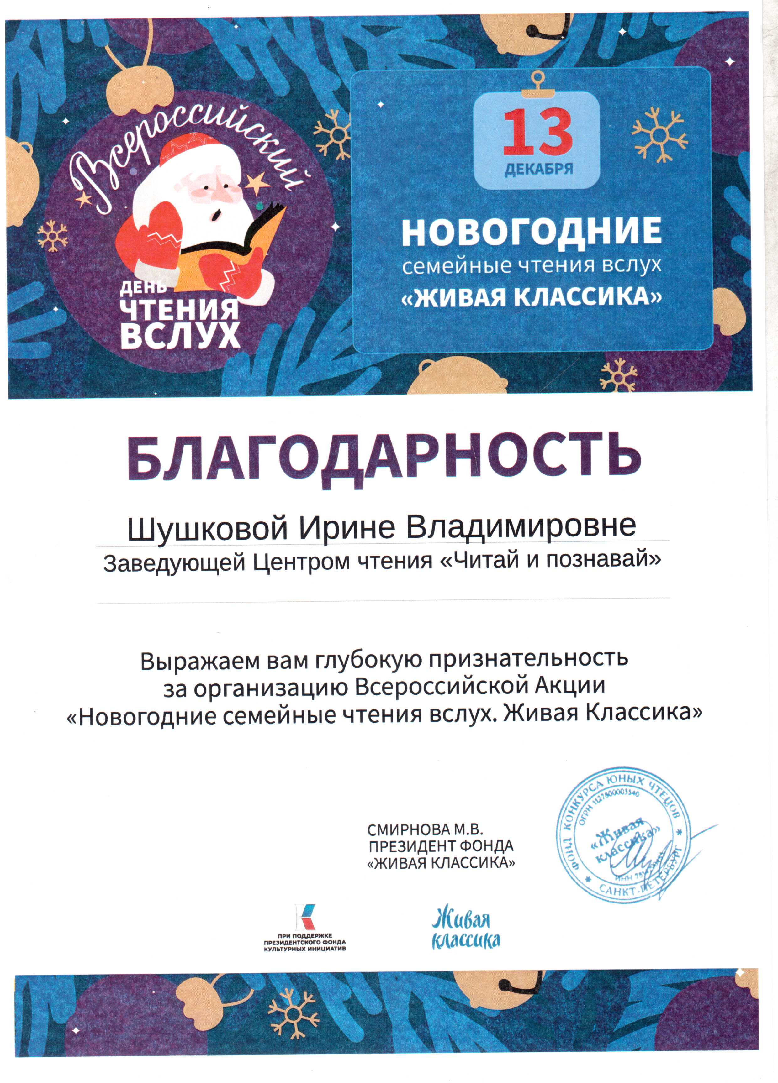 Благодарность Шушковой Ирине Владимировне за организацию Всероссийской Акции "Новогодние семейные чтения вслух. Живая Классика"
