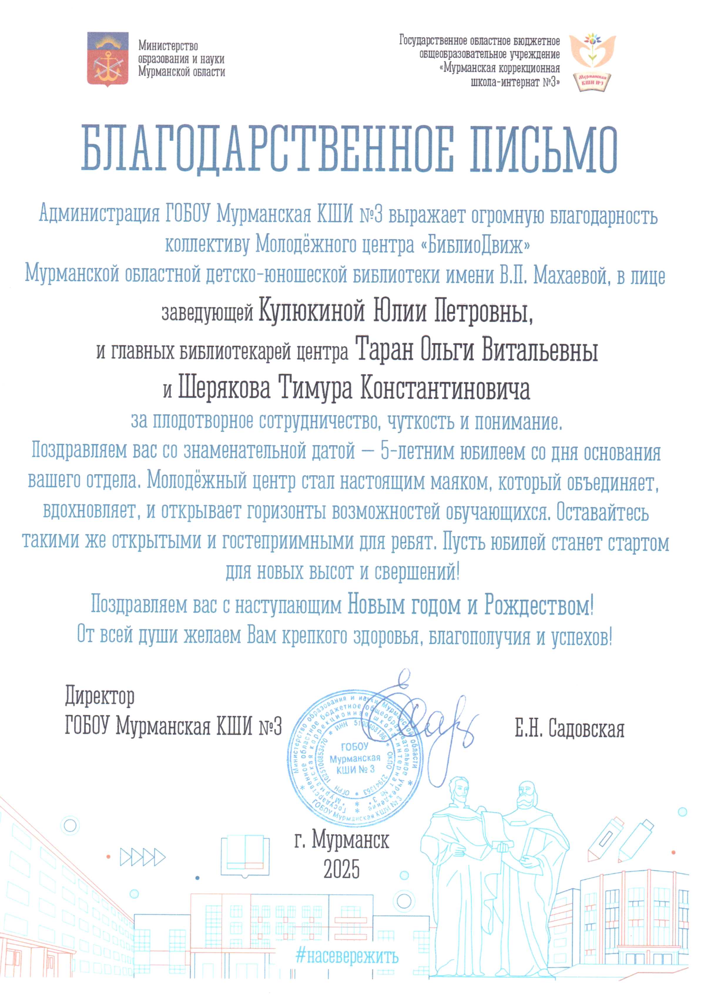 Благодарственное письмо коллективу Молодежного центра "БиблиоДвиж" за плодотворное сотрудничество, чуткость и понимание.