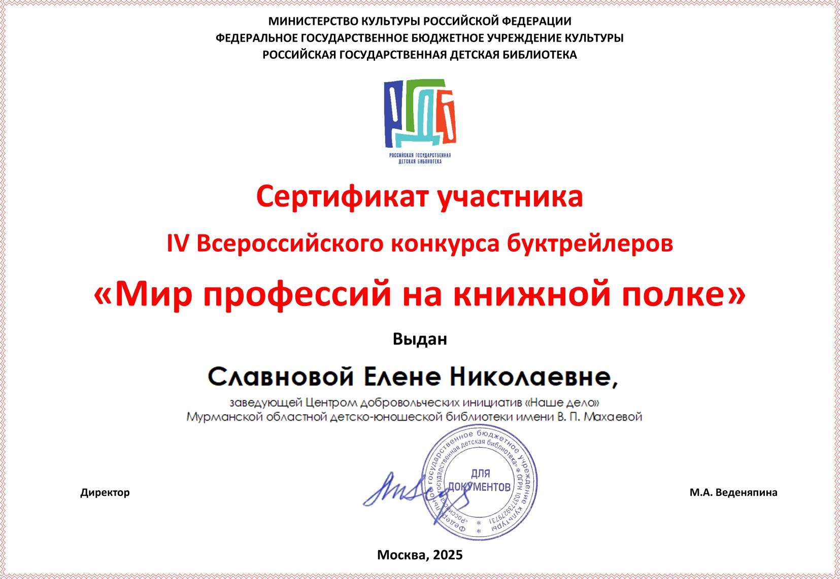 Сертификат участника IV Всероссийского конкурса буктрейлеров "Мир профессий на книжной полке" Славновой Елены Николаевны