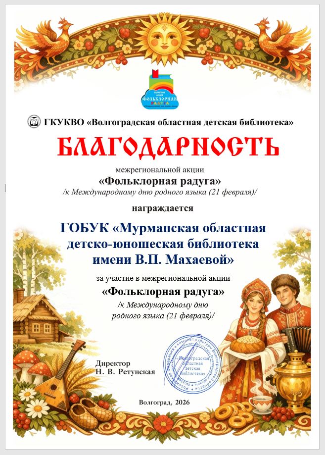 Благодарность за участие в межрегиональной акции "Фольклорная радуга"