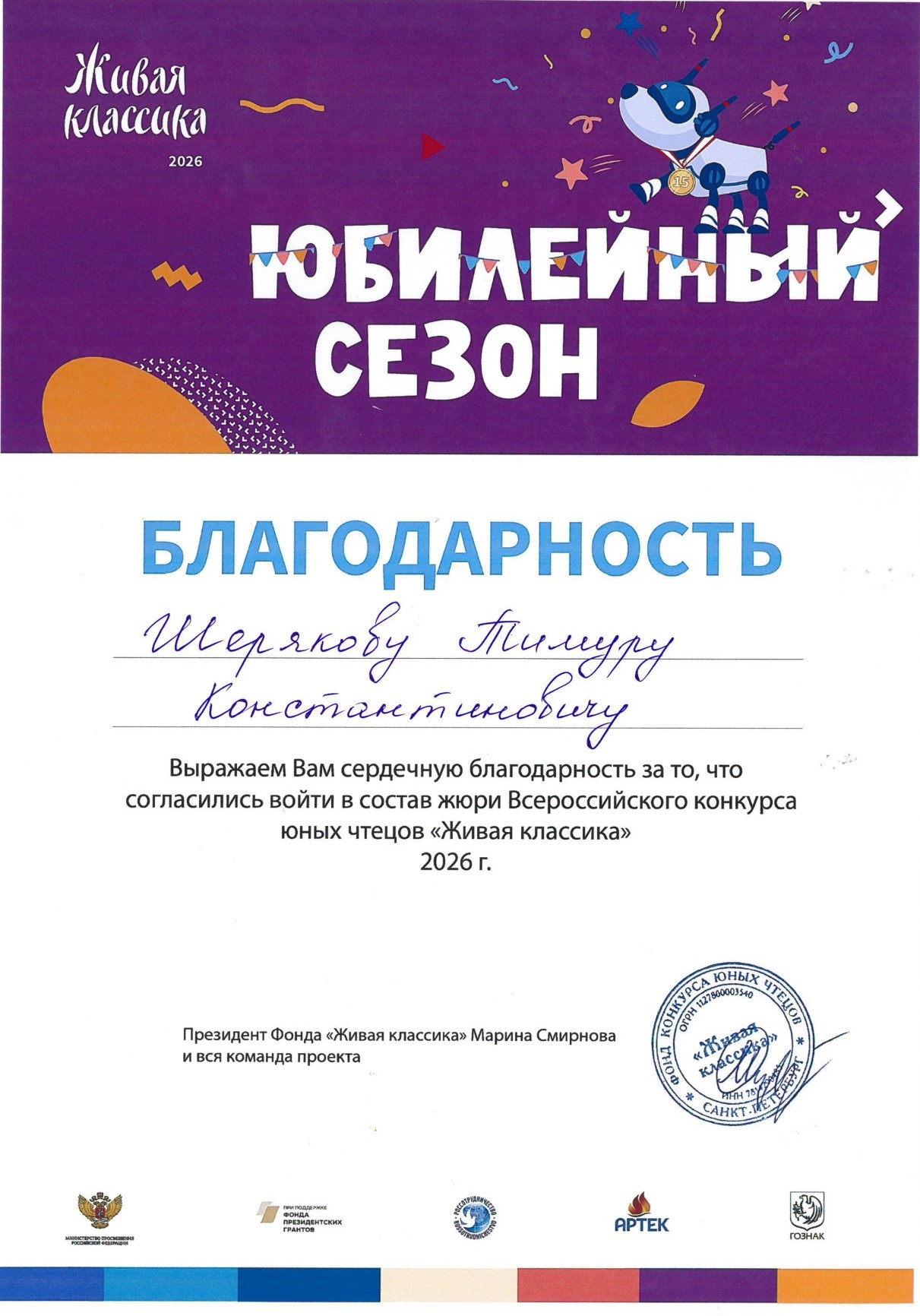Благодарность Шерякову Тимуру Константиновичу за работу в составе жюри Всероссийского конкурса юных чтецов "Живая классика"