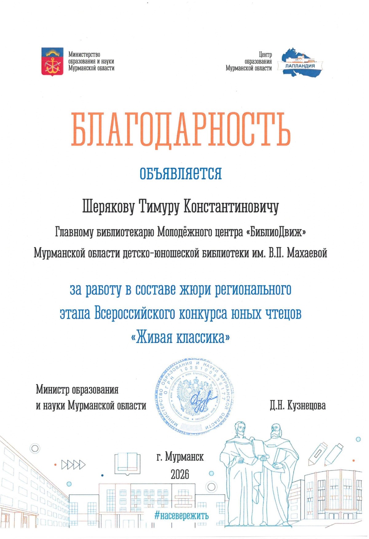 Благодарность Шерякову Тимуру Константиновичу от Министерства образования и науки Мурманской области за работу в составе жюри регионального этапа Всероссийского конкурса юных чтецов "Живая классика"