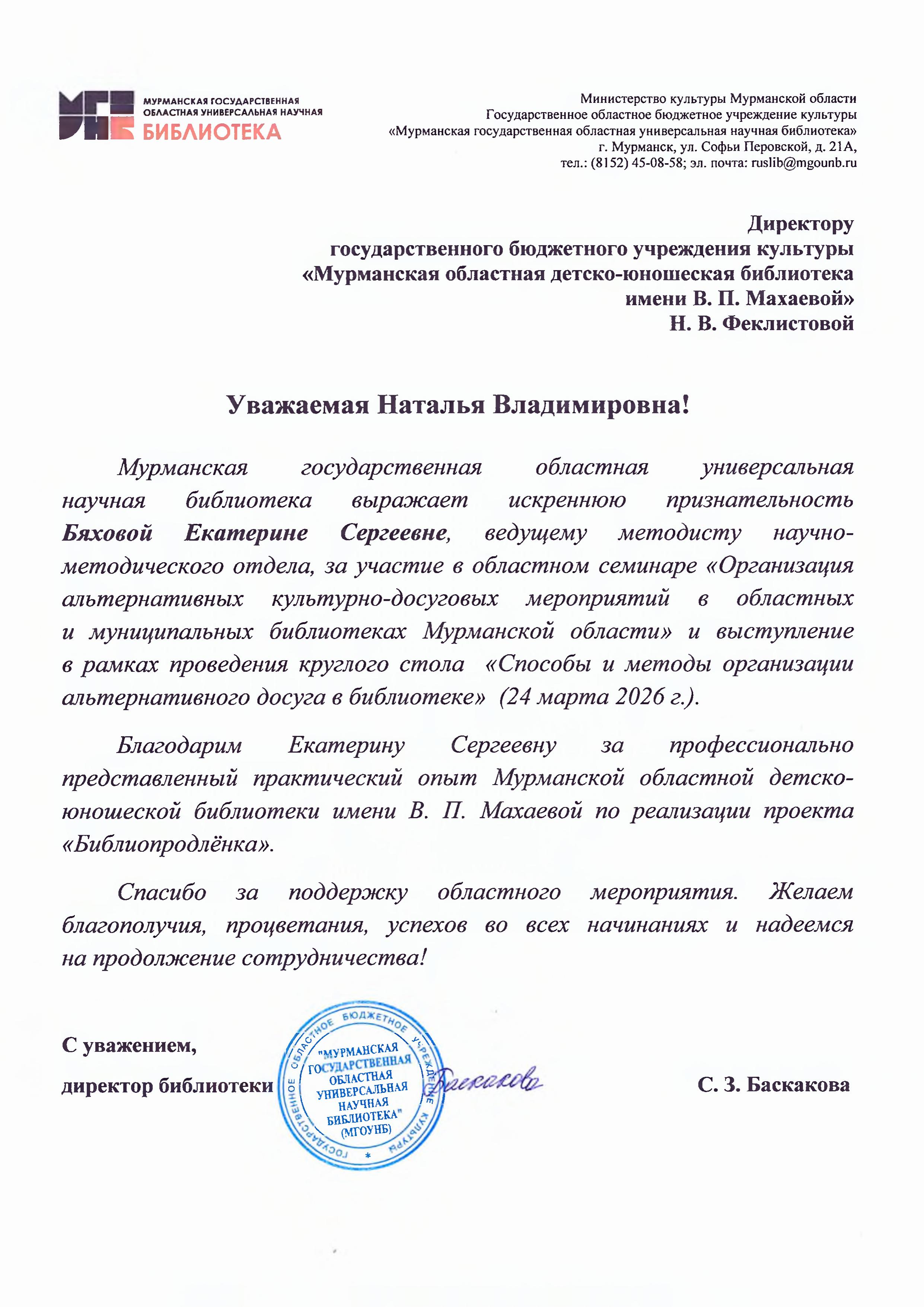 Благодарственное письмо Бяховой Екатерине Сергеевне за участие и выступление на областном семинаре "Организация альтернативных культурно-досуговых мероприятий в областных и муниципальных библиотеках Мурманской области"
