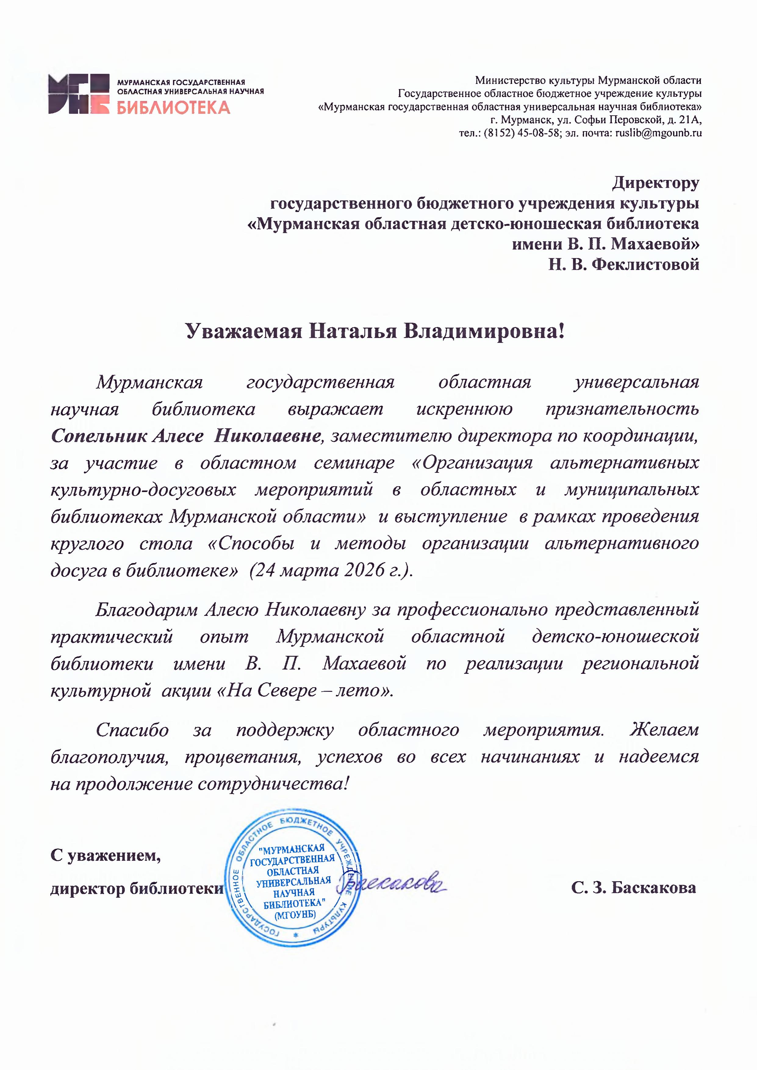 Благодарственное письмо Сопельник Алесе Николаевне за участие и выступление на областном семинаре "Организация альтернативных культурно-досуговых мероприятий в областных и муниципальных библиотеках Мурманской области"