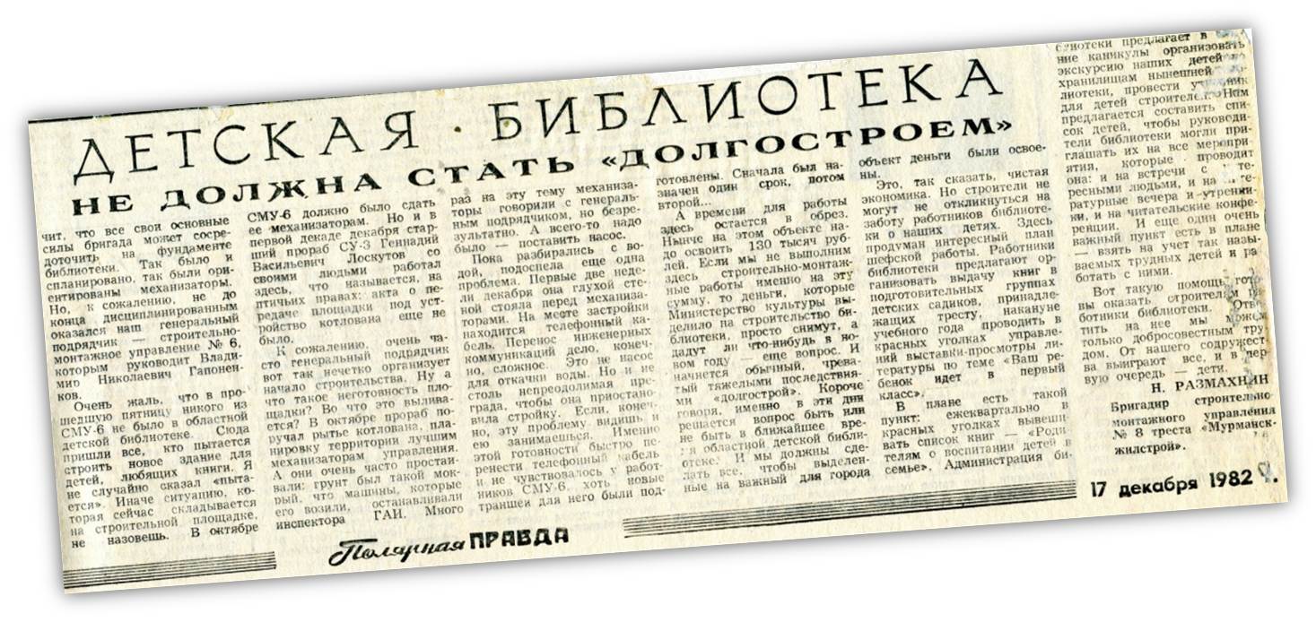 В памятном для библиотеки 1982 году принимается решение о строительстве для учреждения отдельного здания. 14 сентября 1982 года в «Полярной правде» появилась первая статья, где говорилось о том, что мурманских ребятишек в скором времени встретят в прекрасных залах новой, современной, технически оснащенной библиотеки. Долго выбирали место. Наконец, началось строительство. Но процесс затянулся и в 1986 году строительство Областной детской библиотеки объявляется ударной комсомольской стройкой.