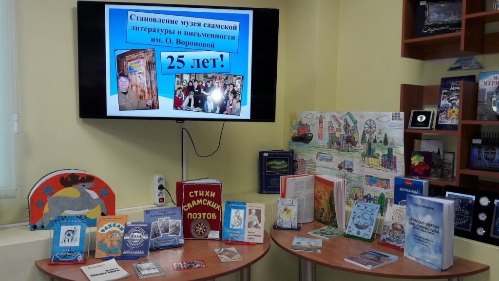Вторая комната посвящена саамской литературе и письменности, писателям и литературе Кольского края, потому что Союз писателей – это окружение Октябрины.