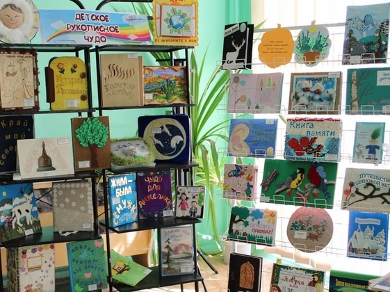 На выставке представлены работы победителей Международного конкурса детской рукописной книги, организатором которого является Мурманская областная детско-юношеская библиотека им. В. П. Махаевой.
