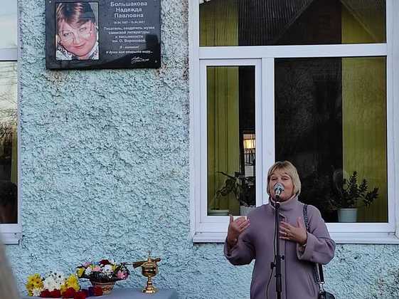 Торжественная церемония открытия состоялась у входа центральной городской библиотеки. Мемориальную доску с изображением Надежды Павловны Большаковой установили на фасаде здания культурного учреждения.