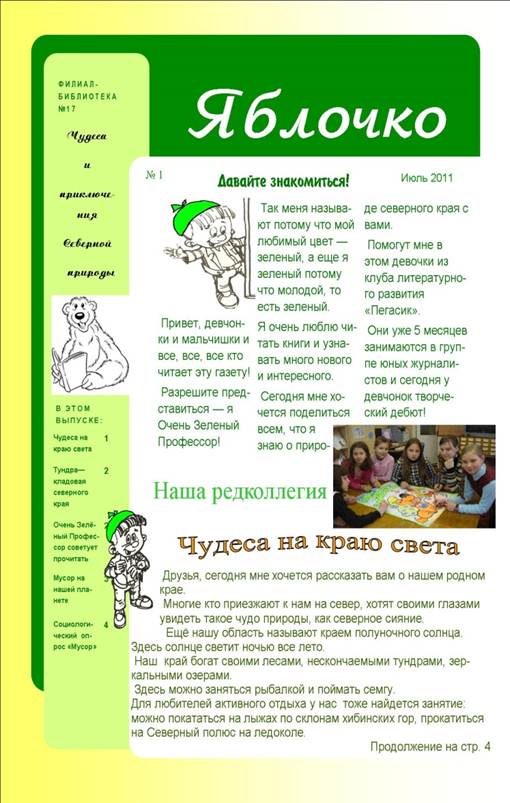 Первый выпуск газеты «Яблочко» повещен экологическим проблемам. Мы библиотека – центр экологического просвещения и на занятиях журналистикой не можем обойти своим вниманием важные и в тоже время доступные для подростков экологические темы. Данной теме посвящены еще несколько номеров.
