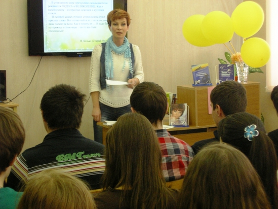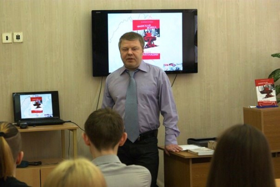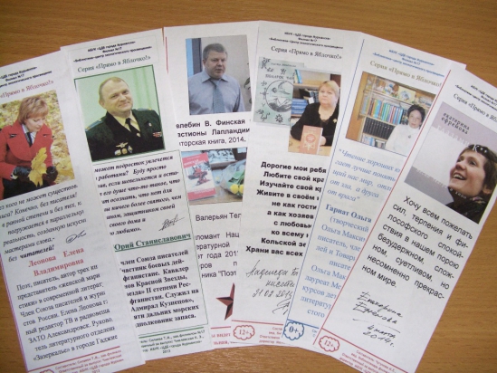 Так была проведены встречи с Еленой Владимировной Леоновой, которая представила свою новую книгу «Четырнадцать прикосновений», Гутяном Юрием Станиславовичем – «Алихейль: «боевые» глазами авианаводчика», Телебиным Валерьяном Геннадьевичем – «Финская война. Бастионы Лапландии», Сусликовым Алексеем Аркадьевичем – «Белки с планеты Хрум», Поливцевой Ириной Андреевной – «Вечности река», Ниной Александровной Соколовой – «Тролли-ангелы» … Каждая книга, так или иначе, раскрывала особенности культуры и истории нашего края, своеобразие характера живущих здесь людей. Как правило, такие встречи проходят со школьниками средних и старших классов, поскольку предполагают серьезный и обстоятельный разговор.