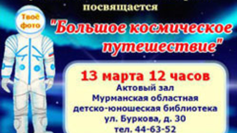 Большое космическое путешествиеВсех, кто интересуется космонавтикой, любит фантазировать и играть, приглашаем в Большое космическое путешествие!Наш «звездолет» отправится 13 марта из актового зала областной детско-юношеской библиотеки (ул. Буркова, д.30) в 12 часов Приходи и стань членом его экипажа! Прими участие в конкурсах и викторинах! Получи призы! Победителя ждет звание «Юный космонавт» Пусть твоими спутниками станут улыбка и хорошее настроение! Ждем!