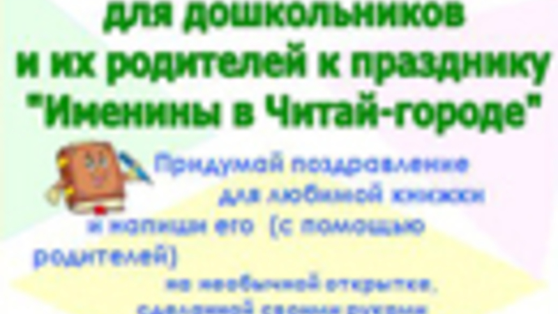 Внимание! Внимание! Внимание!Объявляется конкурс для дошкольников и их родителей к празднику «Именины в Читай-городе»! Придумай поздравление для любимой книжки и напиши его (с помощью родителей) на необычной открытке, сделанной своими руками (размером не более 15х20 см). Работы принимаются до 20 марта 2011 года