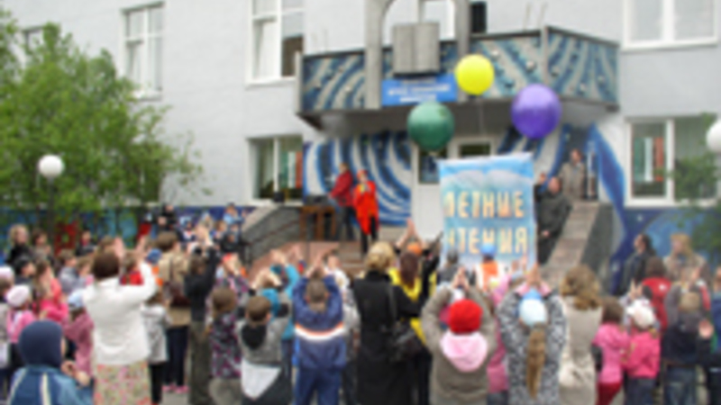 ЛЕТО С КНИГОЙ 2011 10 июня в нашей библиотеке состоялось открытие областных Летних чтений. Участниками праздника стали дети, посещающие летние лагеря отдыха при школах и дошкольных учреждениях, индивидуальные посетители библиотеки. Под веселые, любимые песенки о лете, библиотеке более ста ребятишек водили хороводы, пели вместе с героями известных мультфильмов.Торжественным моментом открытия стал запуск больших шаров с баннером «Летние чтения» и фейерверк