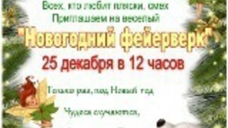 Дорогие дошколята и их замечательные родители! Всех, кто любит праздник зимний, Всех, кто любит пляски, смех Приглашаем на веселый«Новогодний фейерверк» 25 декабря в 12 часов (актовый зал)