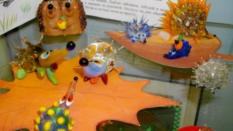 Здесь вы можете увидеть более 70 совершенно разных и необычных ежиков: фигурки из стекла, ракушек и глины, мягкие игрушки, декоративные скульптурки, свечки, солонки, копилки, подставки под ручки и держатели для фотографий. Некоторые ежики сделаны вручную из соленого теста и пластилина. На выставке представлено около 20 миниатюрных ежиков размером от 1 до 3 сантиметров.