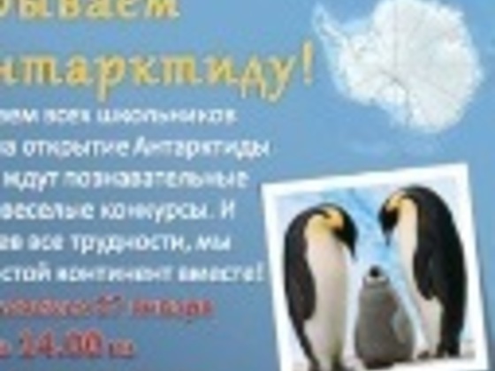 Открываем Антарктиду! Приглашаем всех школьников 5-7 классов на открытие Антарктиды. В пути вас ждут познавательные задания, веселые конкурсы. И преодолев все трудности, мы откроем шестой континент вместе! Отправляемся 27 января в 14.00 из отдела делового чтения.