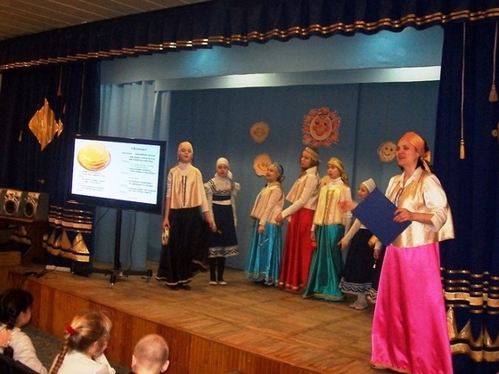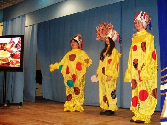 На празднике были использованы разнообразные формы работы: красочная презентация из истории Масленицы, музыкальные и народные игры, разучивание песен совместно с залом. Веселые скоморохи, студенты Мурманского педагогического колледжа, рассказывали сказку о Масленице и веселили зрителей. Несмотря на ненастную погоду и снегопад в зале собралось 70 человек.