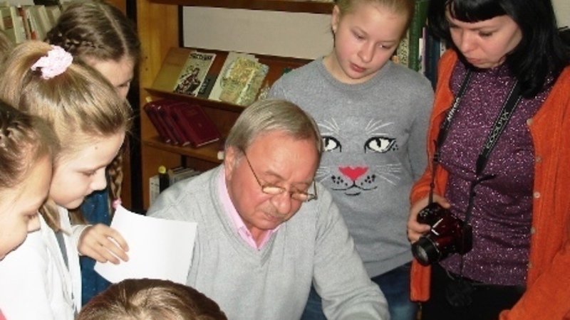 Олег Семенович познакомил юных читателей с основными темами своего творчества. В увлекательной беседе с детьми он рассказал о впечатлениях детства, которые легли в основу многих его стихотворений.