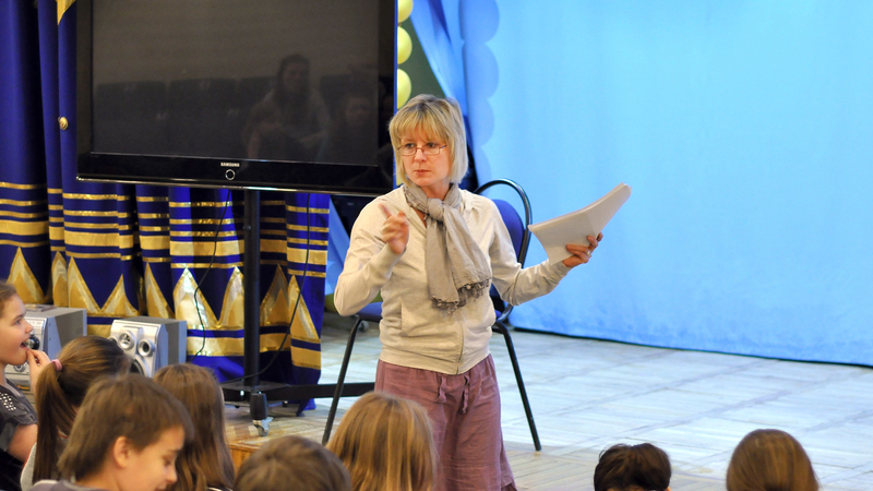 Гостья рассказала о себе, о своем творчестве, поделилась впечатлениями о поездке по Кольскому полуострову. А затем увлекла ребят интерактивным диалогом, в ходе которого рассказывала забавные "страшилки", увлекательные истории из своего педагогического опыта.