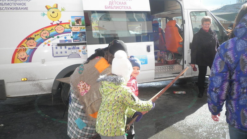 Сначала спешим в детский сад. Малыши уже собираются на прогулку, еще не ожидая, какой сюрприз их ожидает. Очень быстро разворачиваем экспозицию в передвижной детской библиотеке. На площадке звучит музыка, в воздух поднимаются мыльные пузыри. Ребятишек встречают наши сказочные персонажи – веселая и заводная баба Яга и хитрая лиса Алиса. Они устраивают испытания для малышей: вопросы-загадки о сказочных героях, об оснащении библиобуса. За правильные ответы щедро награждали ребят сладкими призами. Не обходится праздник-презентация без катания на метле и без танцев: под веселые детские песенки танцевали вместе с Алисой и бабой Ягой не только детки, но и воспитатели.