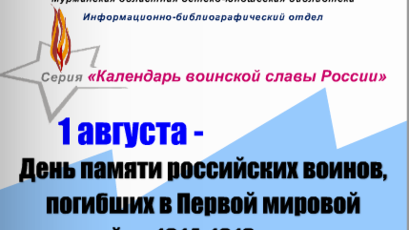 Информационно-библиографический отдел Мурманской областной детско-юношеской библиотеки подготовил памятку «1 августа – День памяти российских воинов, погибших в Первой мировой войне 1914-1918 годов» из серии «Календарь воинской славы России»