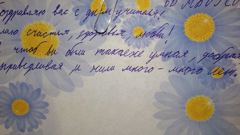 «Дорогая Валентина Михайловна! Поздравляю вас с Днем учителя! Желаю, чтобы вы не болели, чтобы вас слушались, уважали и любили ученики. Вы самая лучшая учительница и самый лучший друг!».