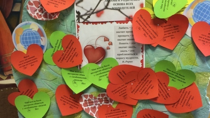 Девиз акции: «Толерантность невозможна без любви!» Дошкольники, учащиеся образовательных учреждений, родители и педагоги знакомились с понятиямм «толерантность», «толерантные отношения», «культура толерантного поведения» и увлеченно отвечали на вопросы викторины, а также оставляли добрые пожелания в адрес сотрудников библиотеки на праздничных «валентинках».
