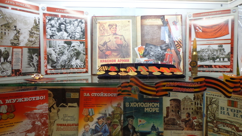 Помимо книг на выставке представлены подлинные награды ветеранов. Размещены здесь также работы участников творческого проекта «Читай во имя мира».