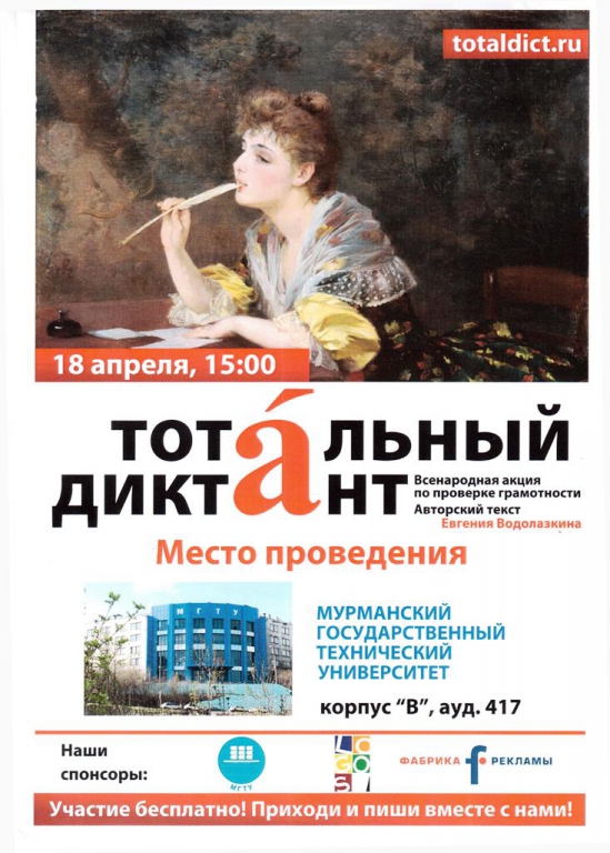 Сейчас в Мурманском государственном техническом университете проходят бесплатные курсы по подготовке к Тотальному диктанту-2015 – «Русский по пятницам». Проводят занятия преподаватели подготовительных курсов, кафедры международных отношений и коммуникаций МГТУ. Занятия проходят в корпусе «М» по адресу: ул. Советская, д. 17, ауд. 101. Начало – в 18 часов.